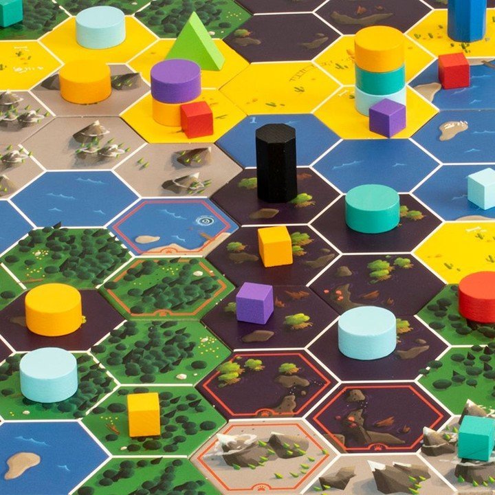 En ouvrant la boîte de Cryptide, on est sans doute un peu déçu : avec un thème pareil, et compte tenu de la couverture, on s’attendrait à un jeu beaucoup plus thématisé, quand le matériel crie son abstraction, et les parties ne consistent guère qu’à poser des cubes et des disques sur des cases colorées…