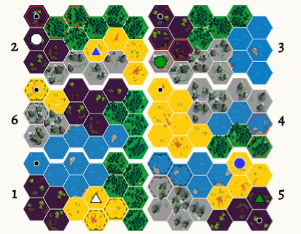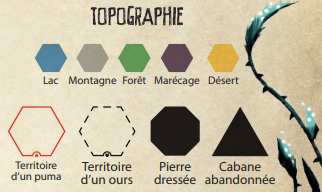 La première étape d’une partie de Cryptide consiste à choisir le territoire sur lequel on traquera la bête. Pour cela, le plus simple est encore de trouver sur le site d’Origames le générateur de partie, qui indique exactement comment disposer les 6 sections de plateau, où placer les jetons Pierre dressée et Cabane abandonnée, et donnant à chacun l’indice qu’il devra conserver secrètement.