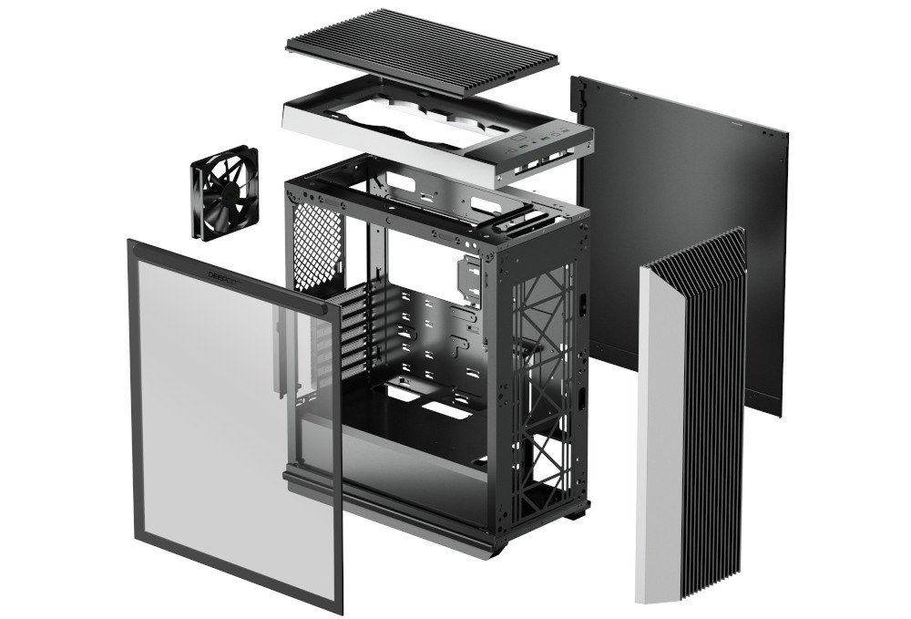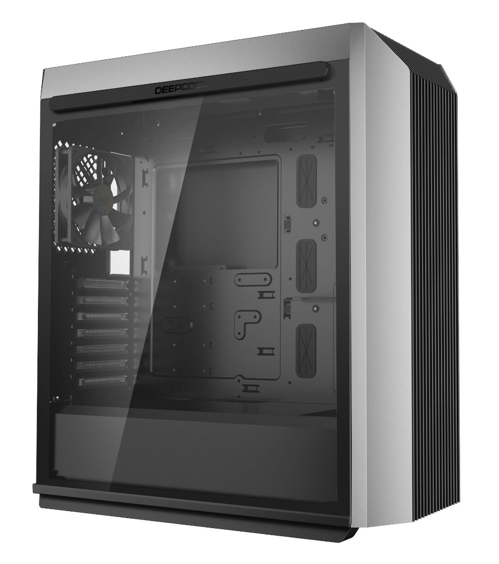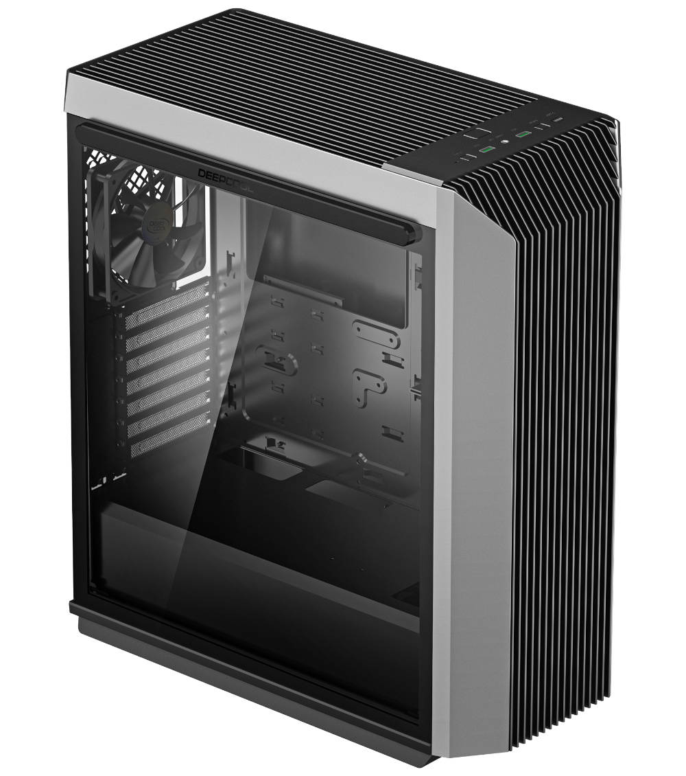 Pour l’extérieur le CL500 arbore un design sobre et industriel. On retrouve évidemment un panneau en verre trempé flanqué du logo DeepCool et maintenu en place par des aimants. Pour ce qui est de la façade le CL500 est très ouvert. En réalité la façade n’a même presque pas d’obstruction du tout ! Les barres verticales reposent sur quatre montant transversales et un filtre à poussière. L’accès à l’air est donc excellent pour cette façade qui supporte jusqu’à trois ventilateurs de 120mm.