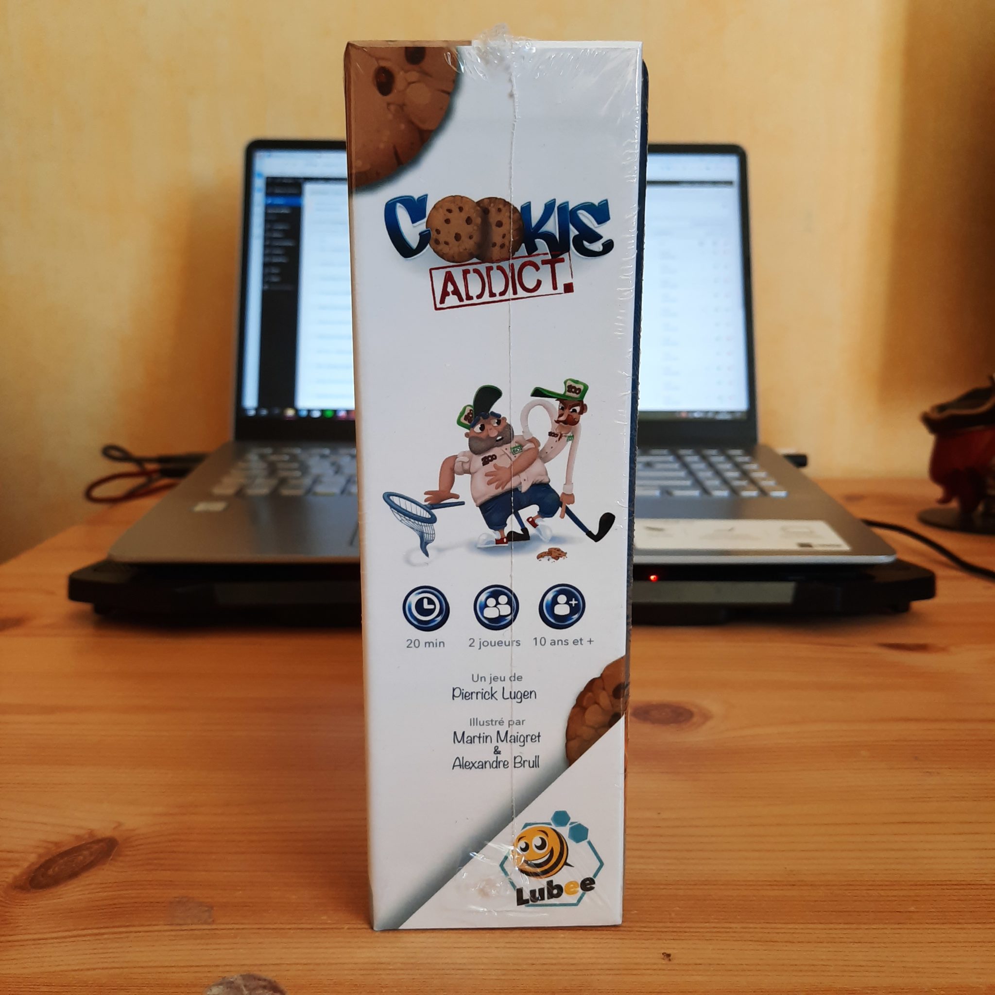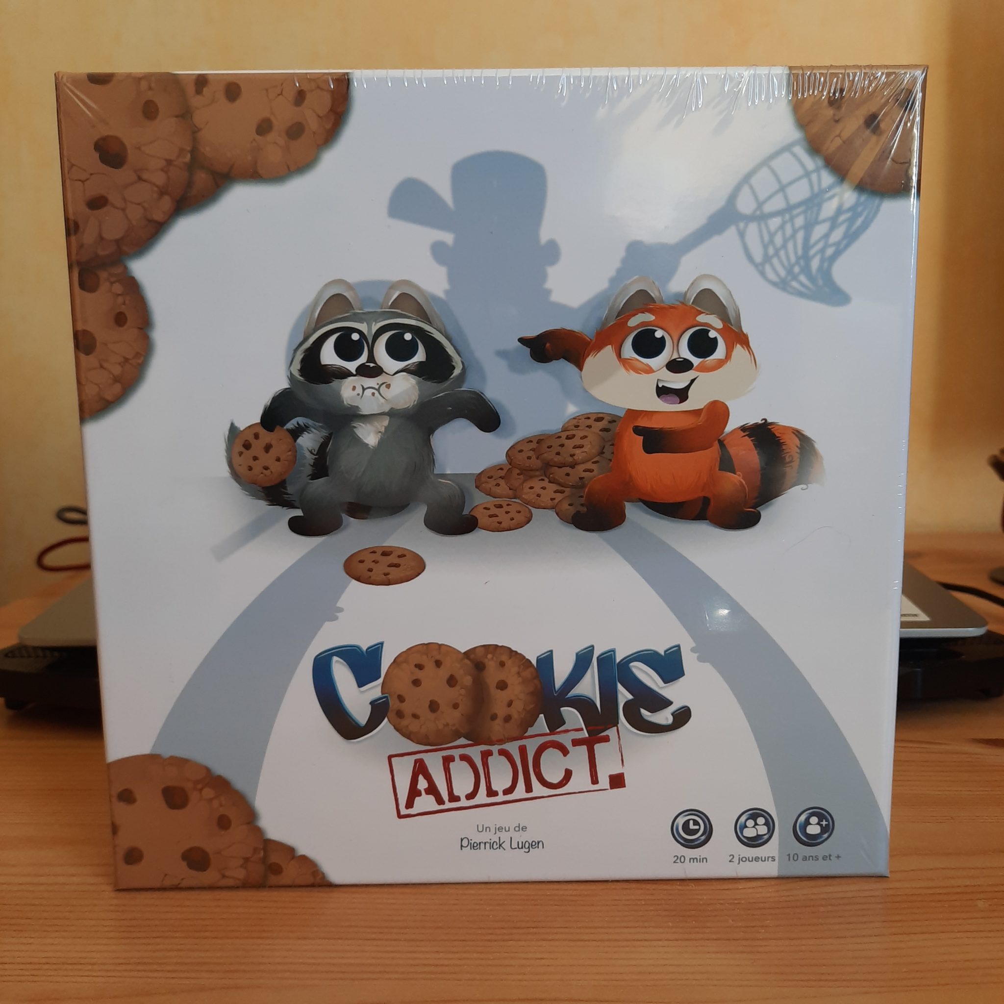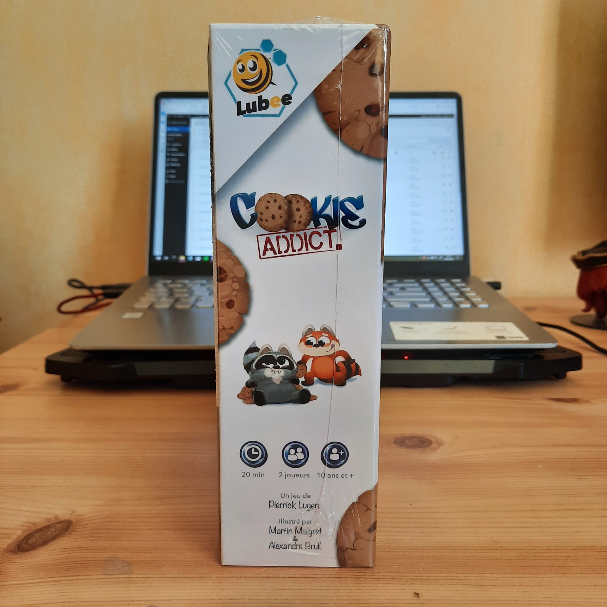 Imaginé par Pierrick Lugen, illustré par Martin Maigret et Alexandre Bull, et édité par Lubee (Guardians of Legends), Cookie Addict – que nous vous avions annoncé ici le 30 juillet dernier – est un jeu de société vendu 17 euros et s’adressant à 2 joueurs de 10 ans et plus dans lequel on incarne un des deux piffres (goinfres) disponibles, un panda roux ou un raton laveur, chacun s’étant échappé du zoo de la ville et cherchant à s’accaparer tous les cookies existants.
