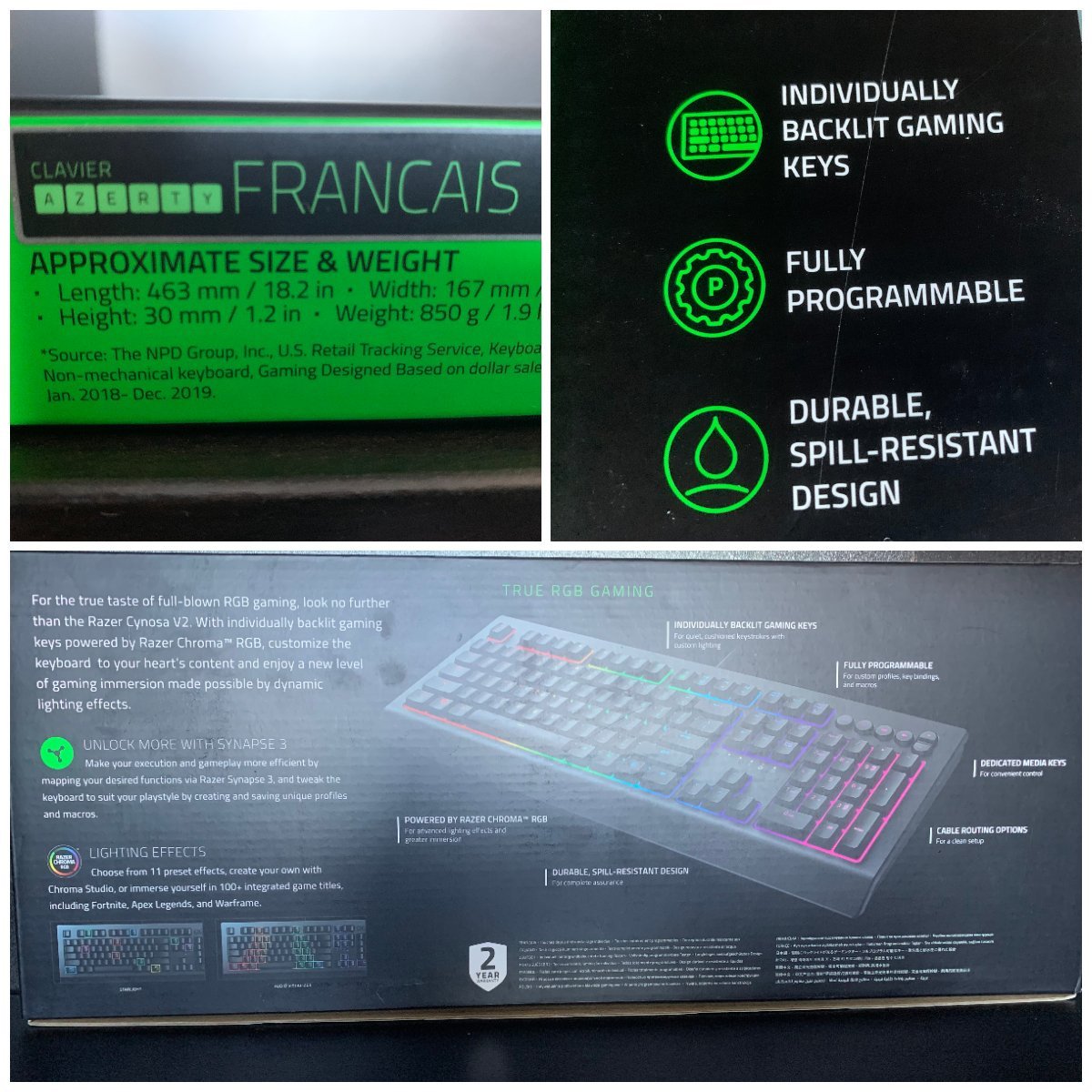 On retrouve ici le packaging classique d’un produit Razer. Le Cynosa V2 est présenté dans un emballage sombre et mat. Fait intéressant, il n’est pas possible d’essayer les touches du clavier comme on peut le constater chez ses grands frères. La marque met en avant au premier coup d’œil différents points propres au clavier en question.