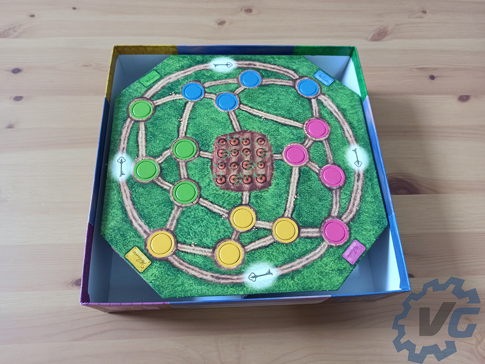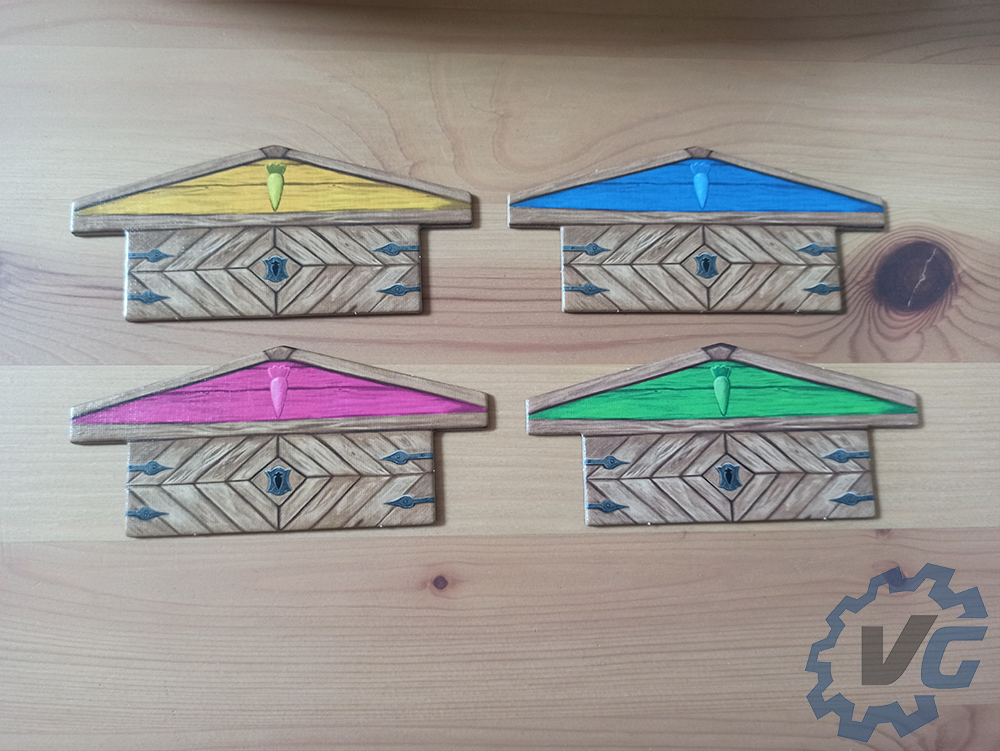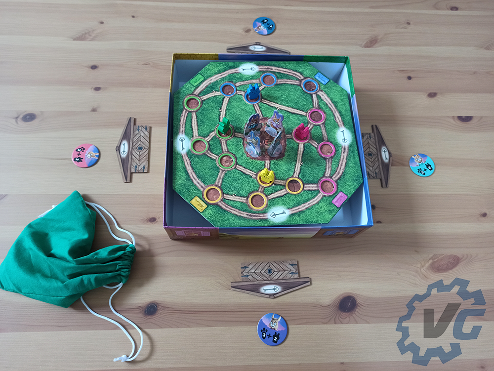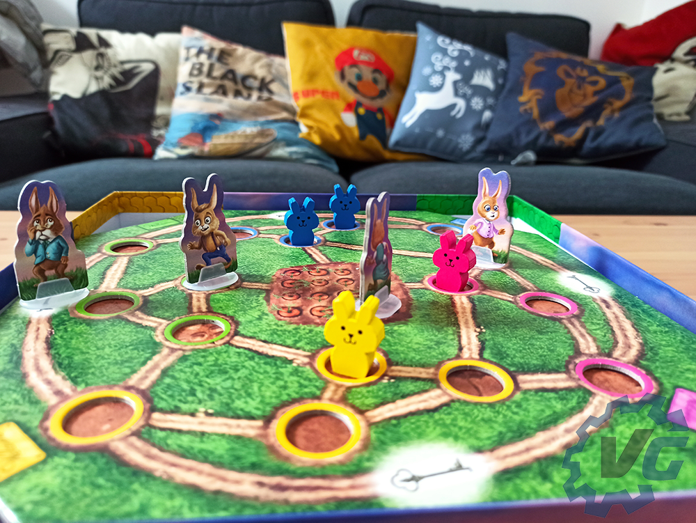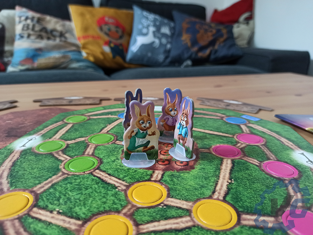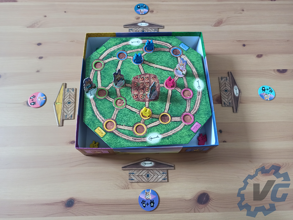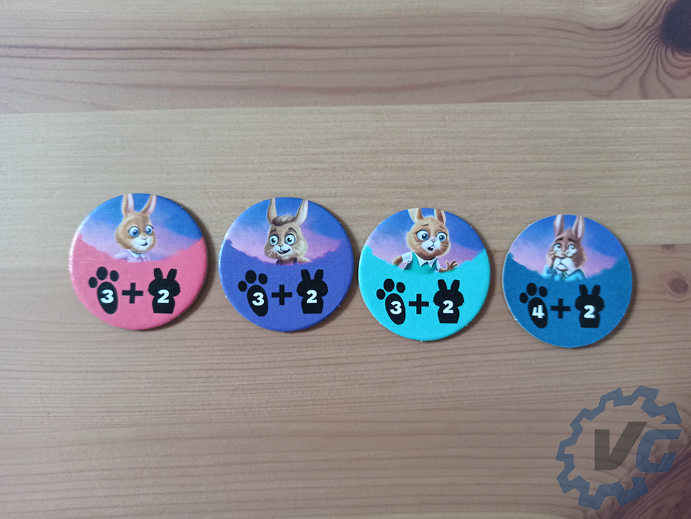 Pour terminer la mise en place, chaque joueur doit choisir une figurine de lapin à incarner. En fonction du personnage choisi, il faudra donner le jeton correspondant à chacun. Chaque joueur place sa figurine au centre du jeu. Dans le sac en tissu se trouvent des petits lapins. Il faudra en choisir quatre et les placer sur le jeu dans les trous de la couleur correspondante au lapin en question. Si vous souhaitez que la partie soit plus difficile, il est possible de récupérer six lapins au lieu de quatre.