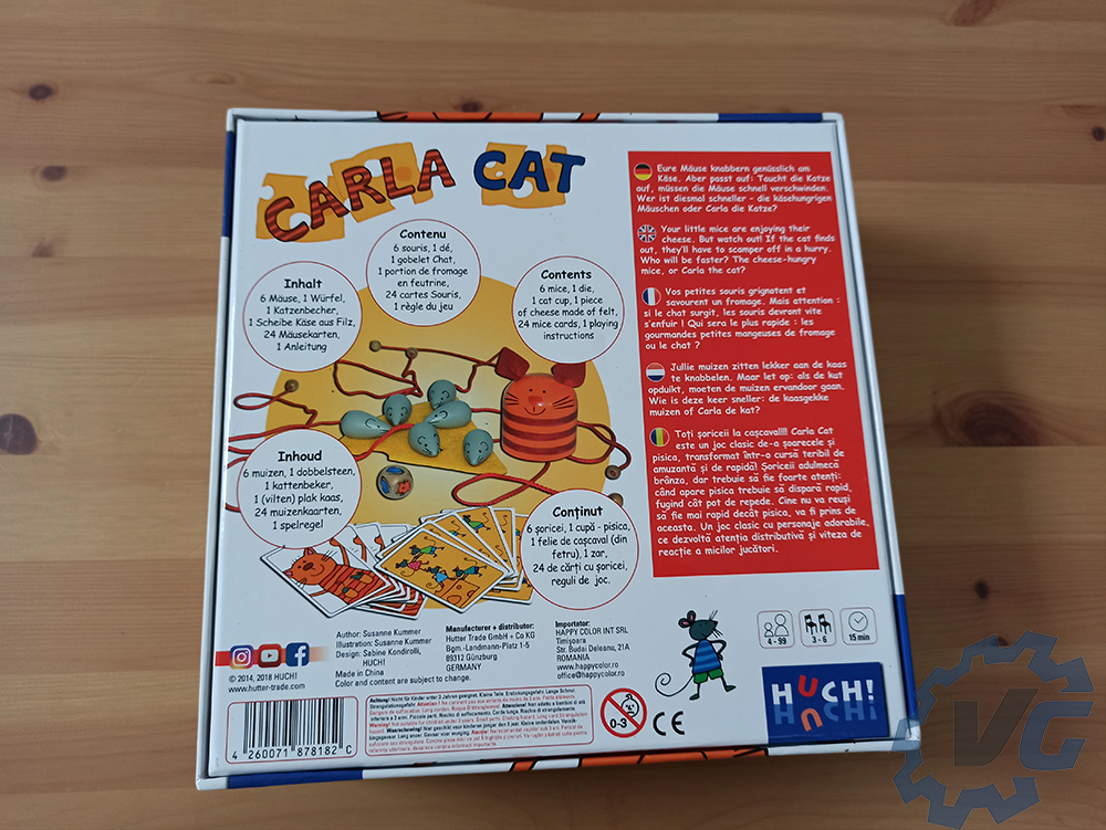 Aujourd’hui, nous vous proposons en test chez Vonguru le jeu de société Carla Cat par Susanne Kummer. Le jeu est édité par Huch!, dont nous vous avions récemment proposé les tests de Cat Stax et Good Night Bunnies du même éditeur. Carla Cat est aussi un jeu plutôt orienté pour les enfants. Ils devront avoir au minimum 4 ans. Une partie va durer en moyenne 15 minutes. Pour y jouer, 3 joueurs au minimum sont nécessaires et 6 au maximum. Il est vendu au prix conseillé de 25 euros.