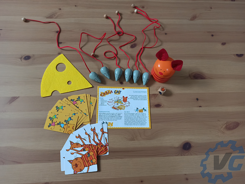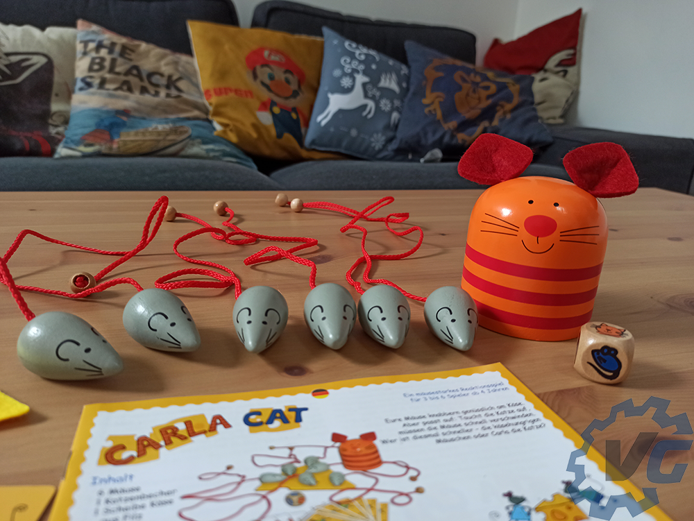 La mise en place de Carla Cat se passe relativement rapidement. Il suffit de donner une souris à chaque joueur, quatre cartes à disposer devant soi et de placer le fromage au milieu de tous les joueurs. Il doit être accessible de chacun. Le joueur le plus jeune incarne le chat pour le premier tour.