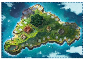 La mise en place commence, on s’en doute, par la pose du plateau central représentant l’île de Pâques, sur une face dépendant du nombre de joueurs impliqués. Le soin consenti par Coimbra, Tobal et Matagot est ainsi d’emblée évident : l’immense plateau regorge de détails assez discrets et nébuleux pour ne pas perturber la lisibilité des icônes mais présents pour faire déborder de vie ce petit monde, tandis que l’accentuation des reliefs entourant l’île donne l’impression d’une pièce tridimensionnelle posée sur le plateau, dans un effet de profondeur qui lui donne un indéniable charme.
