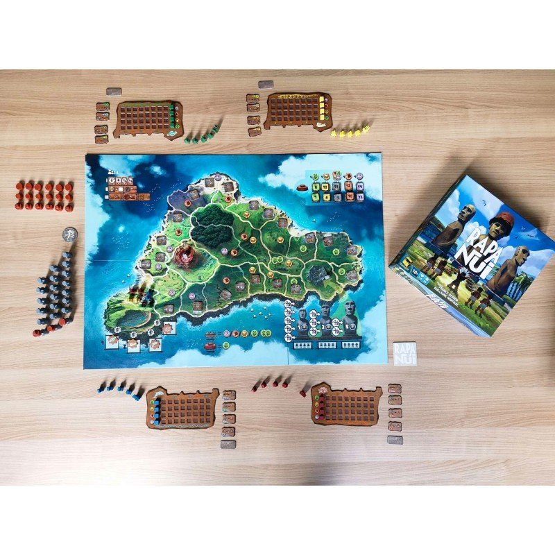Si Rapa Nui est, comme Tikal, Mexica et Java/Cuzco, somme toute assez abstrait, il parvient mieux encore à le faire oublier en s’inspirant de la véritable Rapa Nui, l’île de Pâques, pour la forme du plateau et la disposition des moaï tout autour et le regard tourné vers les terres, et par l’imitation astucieuse de la production des statues dans une carrière et un cratère, puis en faisant de leur transport un important enjeu mécanique. Il faut dire que l’île regorgeant de détails et de vie grâce au trait et aux couleurs de Miguel Coimbra et Sabrina Tobal apporte beaucoup à l’investissement presque anthropologique des joueurs, qui apprécieront aussi beaucoup une iconographie impeccable sur un plateau chargé mais encore tout à fait lisible et rappelant la majeure partie des règles du jeu.