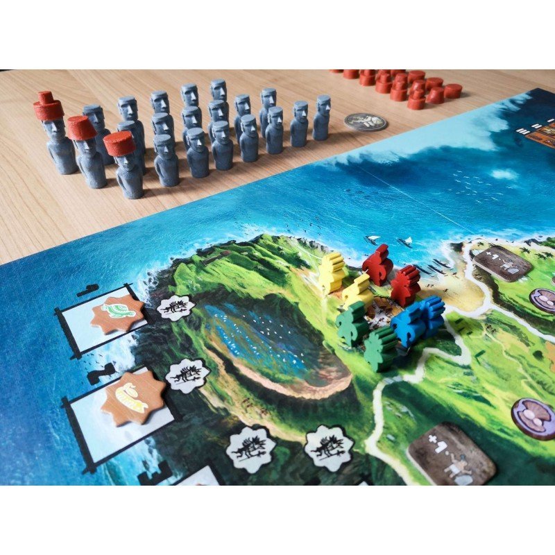 Il ne reste qu’à placer les jetons Animal Totem représentant les joueurs dans un ordre aléatoire sur la piste d’ordre de tour et à placer un meeple Villageois gris sur le cratère et sur la carrière de pukao, deux lieux immédiatement reconnaissables grâce à la qualité du travail sur le plateau.