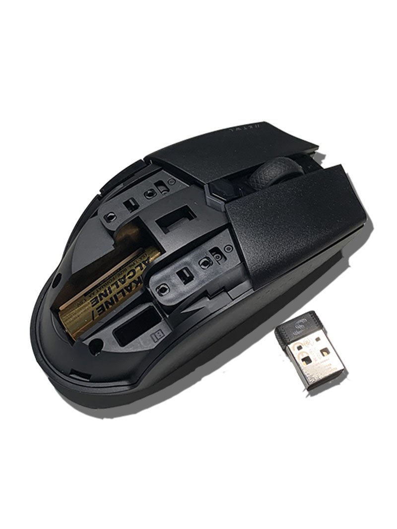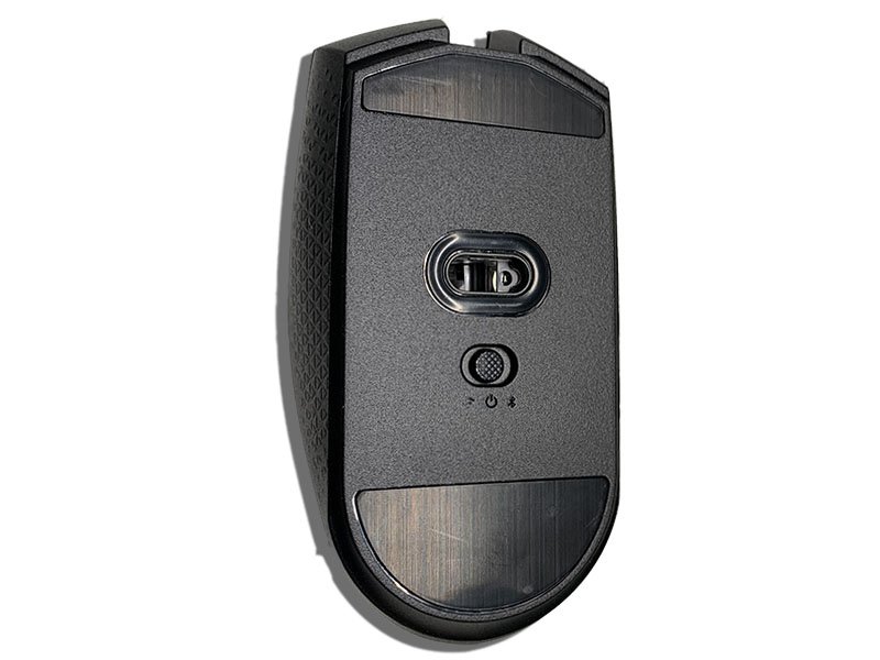Vous l’aurez bien compris, nous avons affaire à une souris à pile. Si pour le moment nous n’avons pas encore pu atteindre les 135 heures de jeu pour vérifier son autonomie, ce point reste incompréhensible. Pour le reste, nous sommes sur des performances attendues pour un produit de ce prix. On notera également des prises latérales en caoutchouc pour assurer une bonne adhérence à la main. De plus, la souris est équipée de deux patins en céramique pour une glisse optimisée sur un tapis. Le dongle USB quant à lui est logé à l’intérieur de la souris. La partie basse de la souris étant coulissante afin de stocker ce précieux accessoire et changer la pile en cas de besoin.