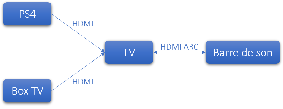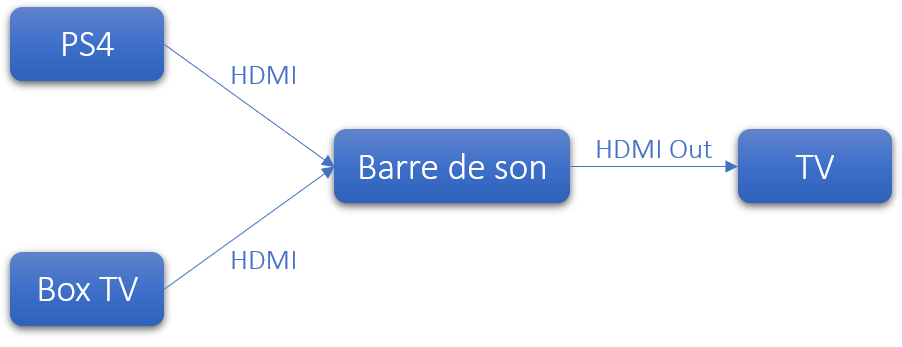 Vous aurez 3 ports HDMI derrière votre barre de son : une entrée (HDMI 1), une sortie (HDMI Out) et un HDMI ARC. L’HDMI ARC est le seul port qui fonctionnera si on le branche sur un port HDMI de la télé, à condition qu’il soit en ARC. Cela vous permet de bénéficier du son sur la barre si vous ouvrez une application directement sur votre télé par exemple. À savoir que les sorties ARC des télés ne sont pas systématiquement compatibles Dolby True HD. Donc de préférence, branchez vos sources sur la barre de son puis la barre de son sur la télé, sauf si vous avez plus de 2 sources ou que vous utilisez souvent des applications intégrées à votre télé.