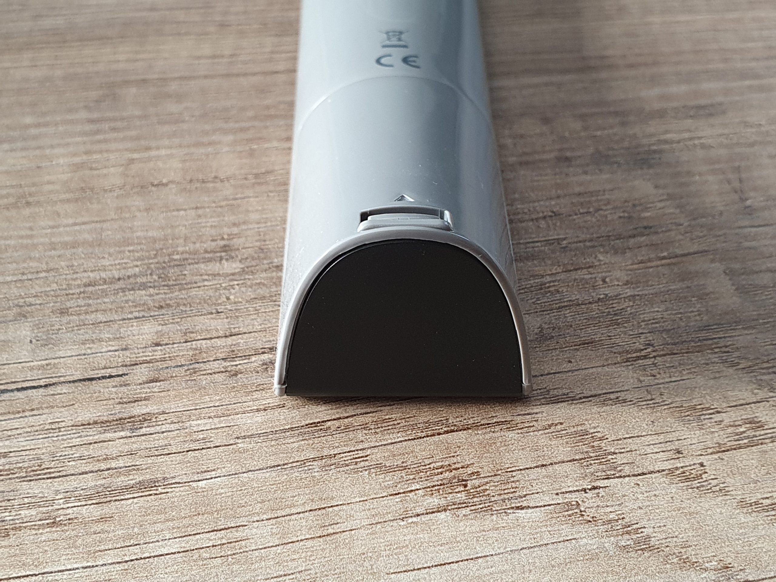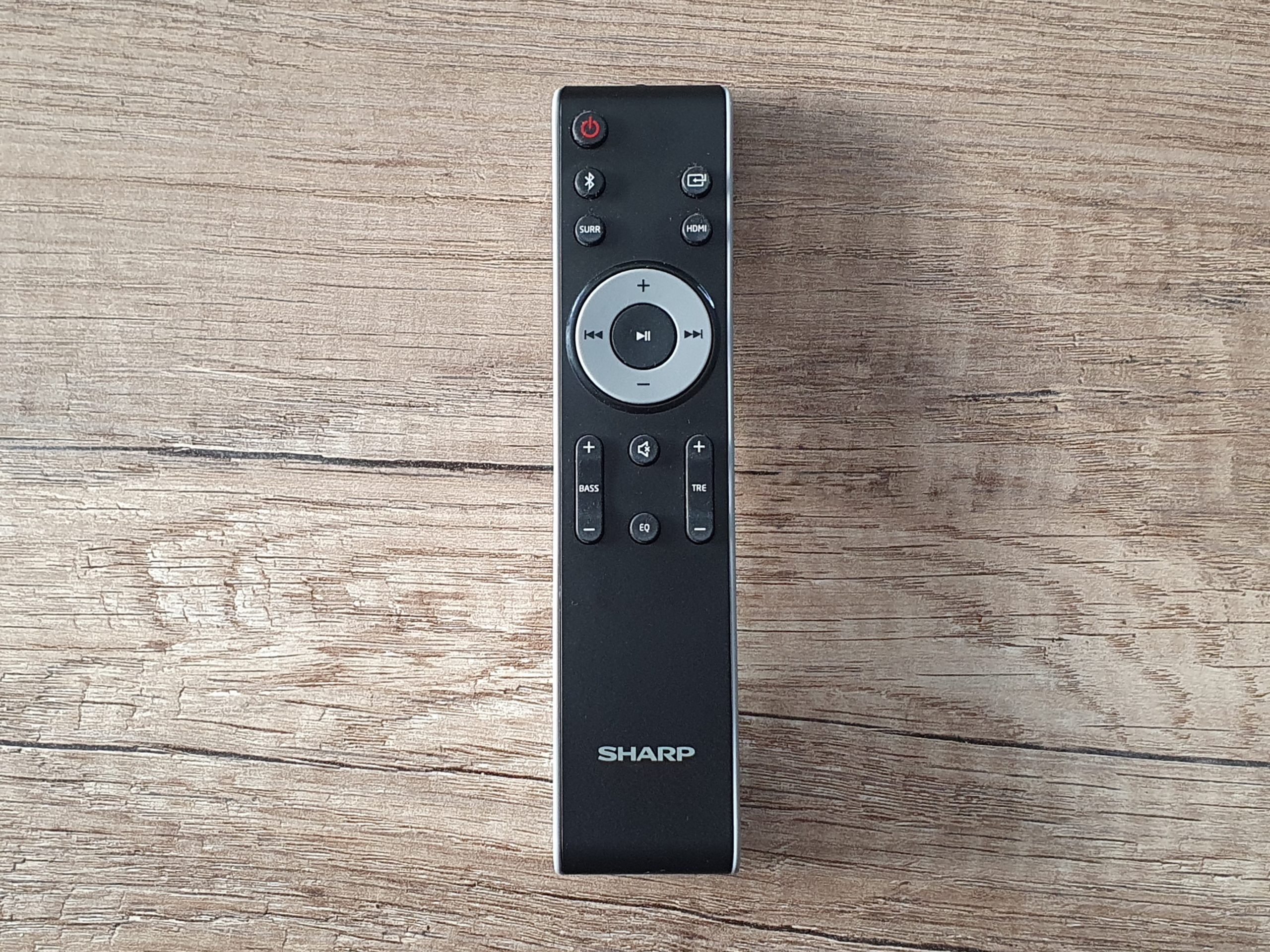 Maintenant regardons la télécommande. Elle est simple et assez intuitive. Par contre elle est arrondie sur le dos, ce qui fait qu’elle roulera quasi systématiquement sur elle-même quand vous la poserez sur votre meuble. Vouloir la poser droite et qu’elle y reste rappelle le jeu du château de carte quand on était petit… Les piles AAA (fournies) sont rondes oui, mais Sharp aurait pu imaginer une télécommande qui ne roule pas sur elle-même !