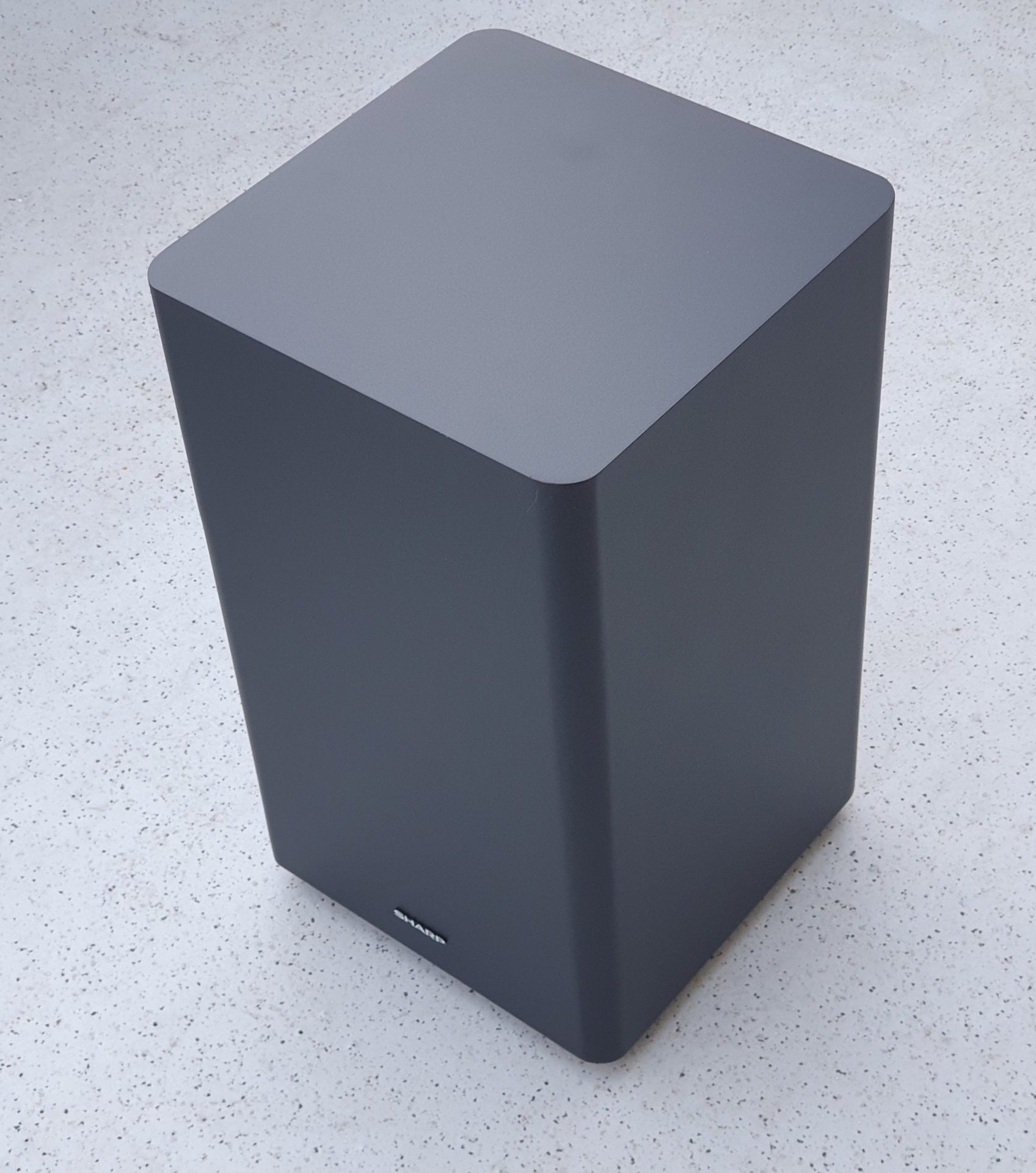 Mais dans le kit Sharp HT-SBW460, est livré un caisson plutôt mignon. Ses petites dimensions (24 cm de large, 24 cm de profondeur) lui permettent d’avoir une toute petite empreinte au sol, il se place partout. Il fait 41.5 cm de haut, soit environ la hauteur de la plupart des meubles TV. Le haut parleur est sur le bas du caisson, ce qui le rend pas apparent au premier regard, et ainsi donne un aspect plus sobre à l’ensemble. Bien évidemment le caisson est posé sur pieds, ce qui est indispensable lorsque la membrane est orientée vers le bas. On peut noter les coins arrondis du caisson, qui donne cet aspect très sympathique à ce petit cube. La texture est légèrement plus granuleuse que la barre, et il n’attrape pas non plus les traces de doigts.