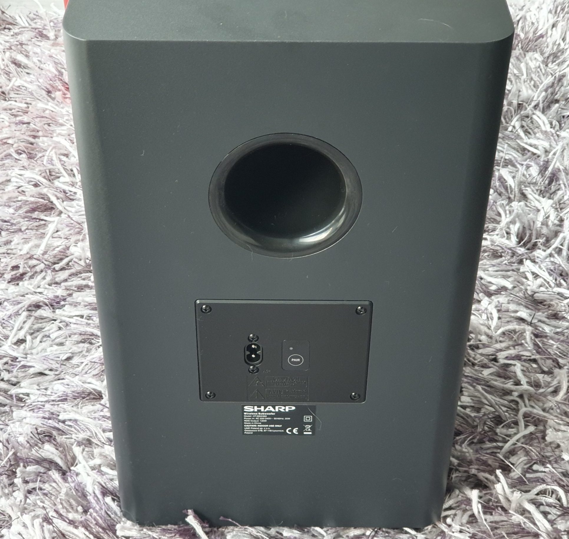 Le caisson lui n’a aucune connectique, il se branche uniquement sur le secteur. Dans ce cas, où se branche le câble RCA du Subwoofer ? Nul part, le caisson se connecte automatiquement sans fil à la barre de son. Sharp précise 6m de portée maximum, ce qui est bien suffisant pour la plupart des salons. Cela simplifie l’installation du kit, tant visuellement que dans la pratique.