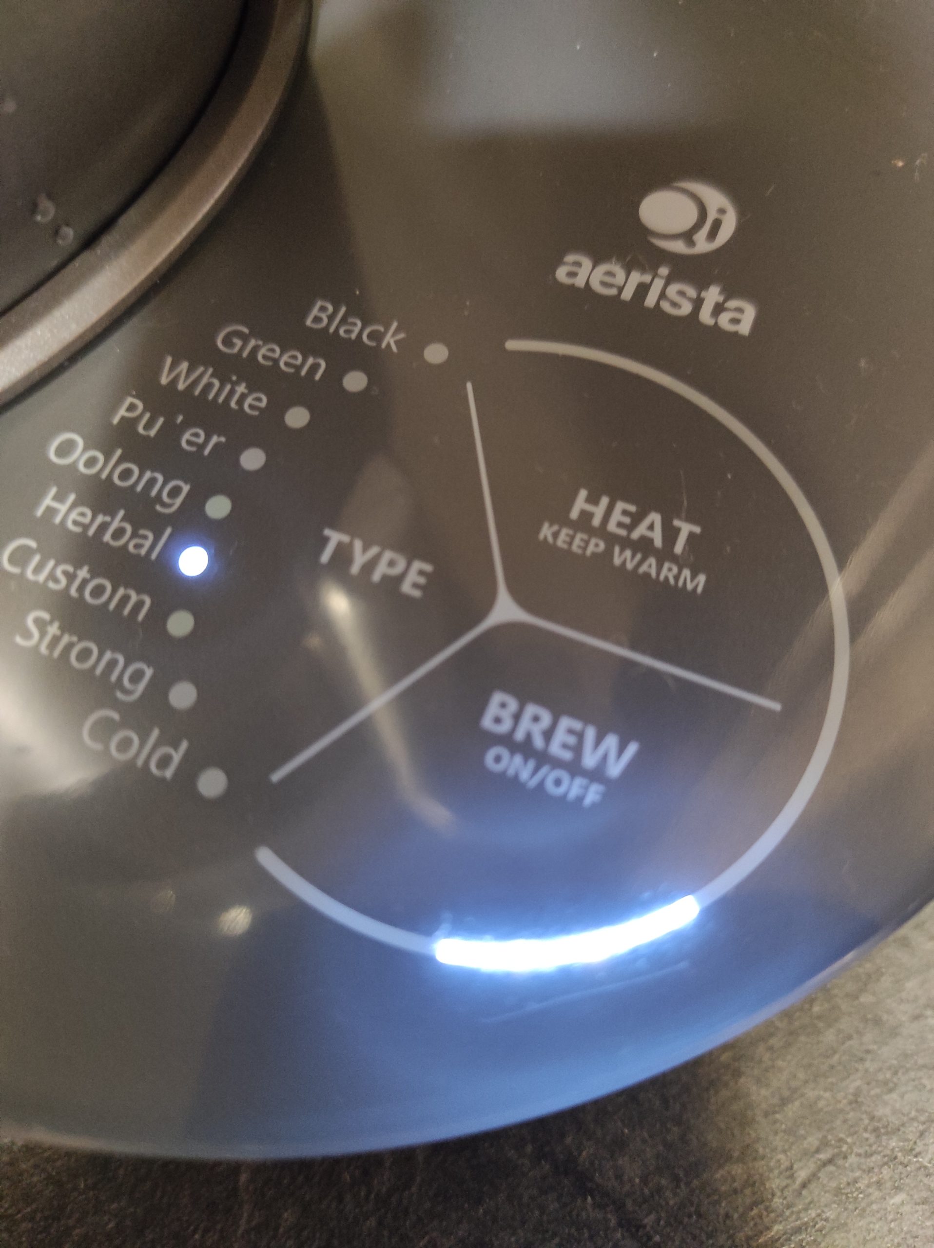 À l’usage, rien de plus simple que la Qi Aerista : on verse dans le pot la quantité désirée d’eau (jusqu’à 750 ml), puis dans l’infuseur (grand récipient sous le couvercle) la quantité désirée de thé (sans boule ou filtre, sauf pour le thé vraiment poudreux, mais cela peut être un sachet si vous n’avez rien d’autre), on allume l’appareil par une pression de 2 secondes sur Brew, on sélectionne le type de thé (qui correspond à une température et à un temps d’infusion) parmi neuf options (noir, vert, blanc, pu’er, oolong, herbes, personnalisé, fort – pour les thés au lait notamment – et froid – on y revient) avec Type, puis une nouvelle pression de Brew lance l’infusion.