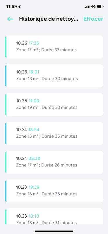 - Consultation de l’historique de nettoyage : consultez l’historique de nettoyage pour savoir où et combien de temps RoboVac a nettoyé votre sol.