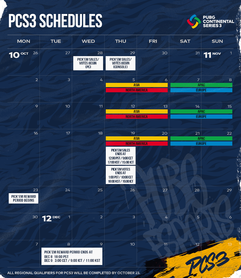 Suite à ses nombreuses mises à jour introduisant entre autre sa saison 9, PlayerUnknown’s BattleGrounds (PUBG) fait encore parler de lui. Les PlayerUnknown’s Battleground Continental Series 3 (PCS3 – compétition mondiale sur le jeu) rentrent en effet dans leur dernière ligne droite en ce mois de novembre 2020. En effet, suite aux qualifications s’étant terminé récemment, les fans pourront suivre les Grandes Finales durant les prochaines semaines (dont les 3 weekends suivant celui du 7 et 8 novembre 19h, pour les compétitions européennes). Tous ces matches seront à suivre en direct sur Twitch quand l’intégralité des résultats en cours est disponible sur le site de PUBG Esport (retrouvez l’intégrale de la programmation sur l’image ci-dessous).