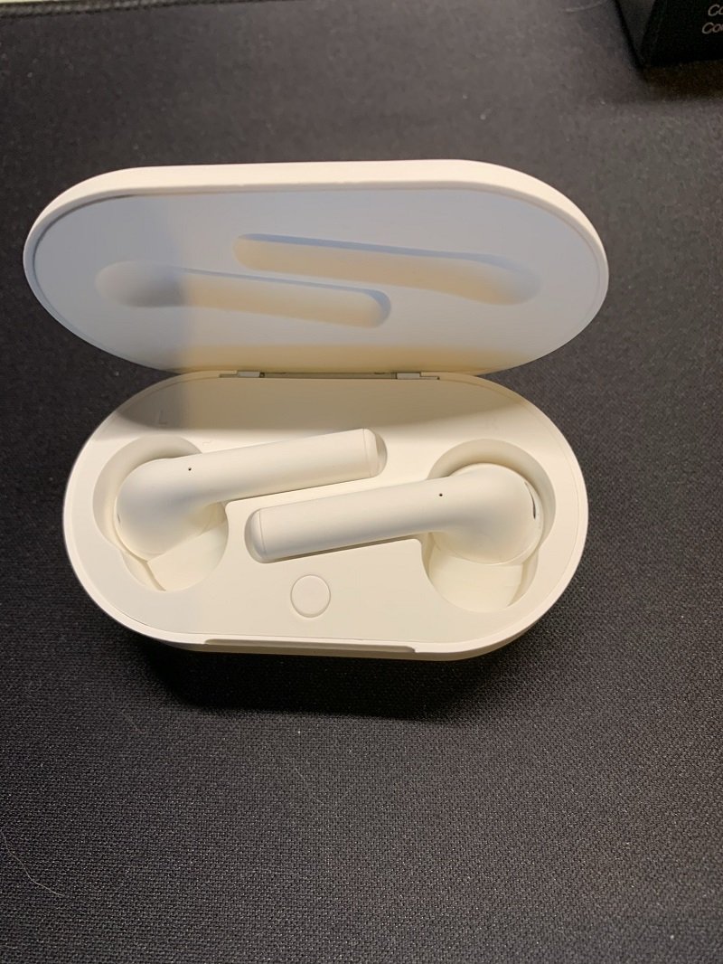 À l’intérieur de la boîte va se trouver bien entendu le boîtier de chargement accompagné des deux écouteurs. Le boîtier, disponible en trois coloris (blanc, noir et rose) est ici en blanc, couleur classique des écouteurs. Accompagné du produit principal, on va retrouve un câble de chargement (en USB-C) d’une longueur de 1 mètre 50 environ. On note l’absence ici d’un adaptateur secteur, sensiblement pensé pour réduire les coûts de fabrication. La charge s’annonçant comme extrêmement rapide, on se passera donc de cela au profit d’un branchement sur PC.