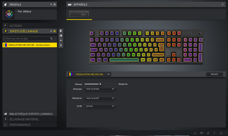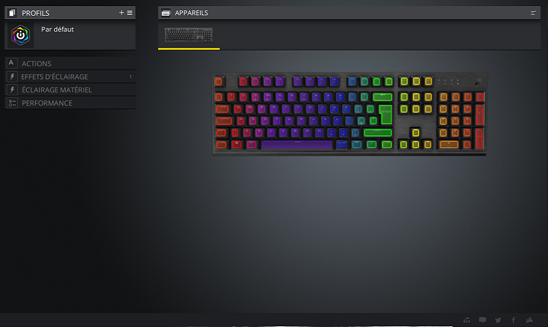 Ce qu’il y a de bien avec les périphériques Corsair, c’est que vous pourrez toujours les brancher en un clique et directement commencer à jouer. Le K60 RGB Low Profile ne fait pas exception à la règle. Néanmoins, on pensera bien évidemment à passer par le logiciel iCue que l’on ne présente plus pour tout ce qui touche à la configuration esthétique de notre appareil. En effet, il nous est possible de configurer 100% des touches du clavier pour leur donner le coloris (parmi 16.8 millions de couleurs) et l’intensité lumineuse qu’on souhaite. Le clavier réagira aussi en fonction du jeu que vous lancez, si ce dernier est supporté par le programme de Corsair.