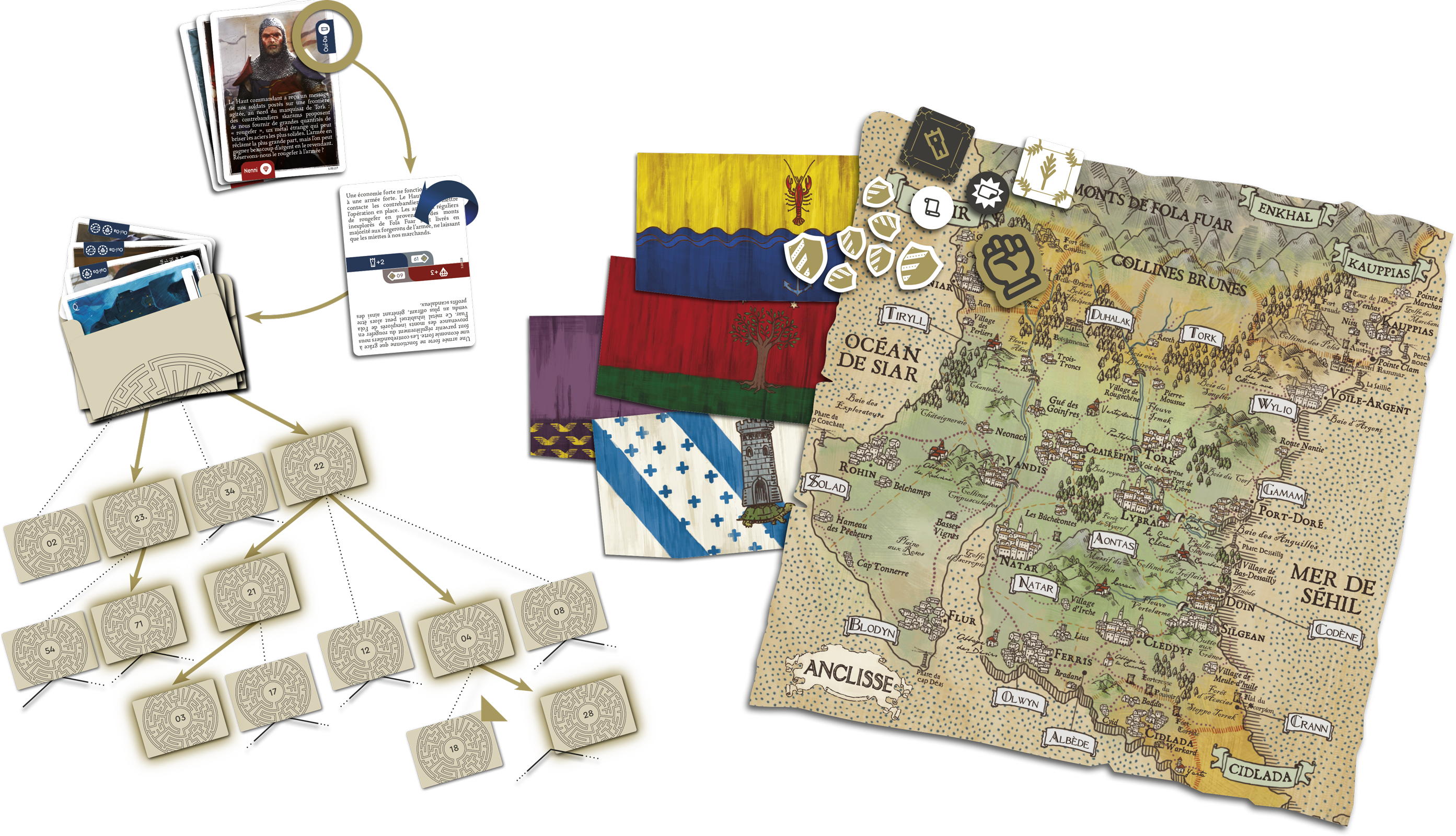 De ce point de vue, la réussite de Call to Adventure est plus paradoxale. Ses illustrations semblent en effet confirmer absolument son titre et son thème, l’idée d’un jeu narratif à embranchements multiples où le joueur va définir sa voie, alors qu’il est en fait beaucoup plus abstrait, davantage porté sur les combos que sur l’intrigue, même si son mode solo/coopératif retrouve un peu d’immersion. Il est ainsi frustrant d’être confronté aux superbes aquarelles des très nombreuses cartes sans qu’elles racontent vraiment ce qu’elles représentent, ce que l’on compensera avec le plaisir de manier de petites runes, dés à deux faces particulièrement élégants.