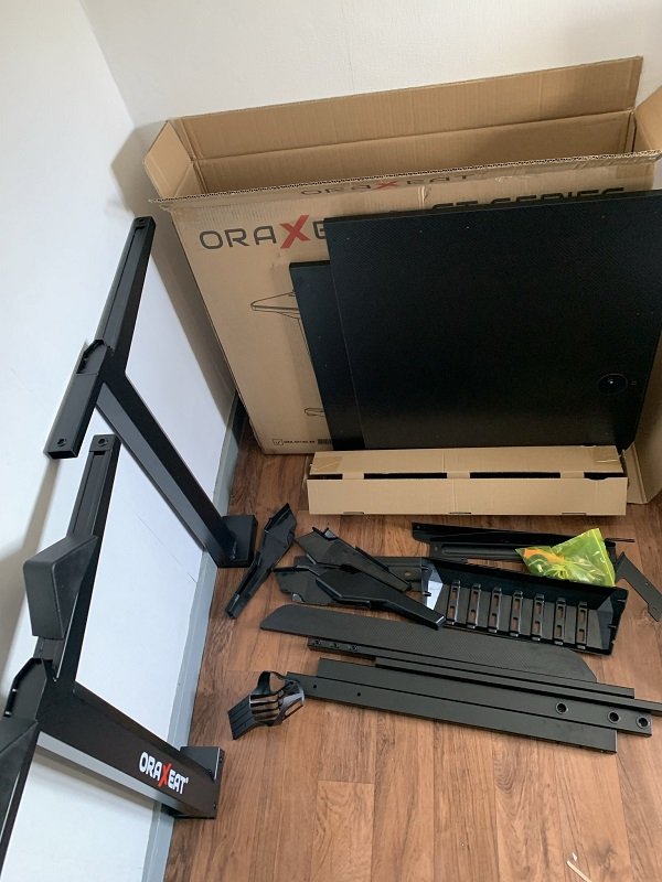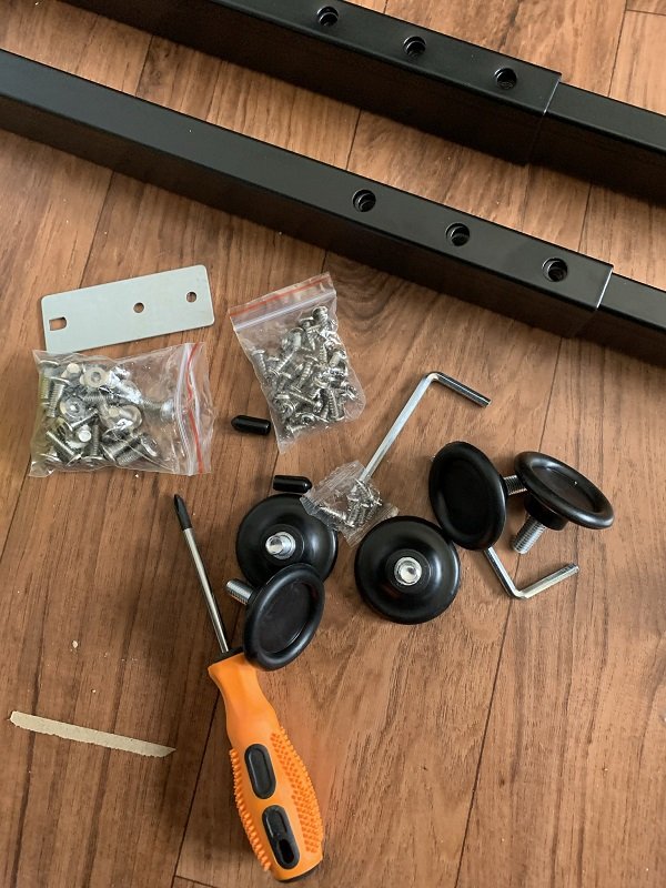 Une fois que tout est déballé, on se retrouve donc avec les deux pieds servant de base. Plusieurs tiges de métal, le plateau divisé en deux parties ainsi que toutes les pièces de montage. On notera une mention spéciale pour Oraxeat au tournevis fourni dans les accessoires. Parfait pour ne pas se tromper de dimension !
