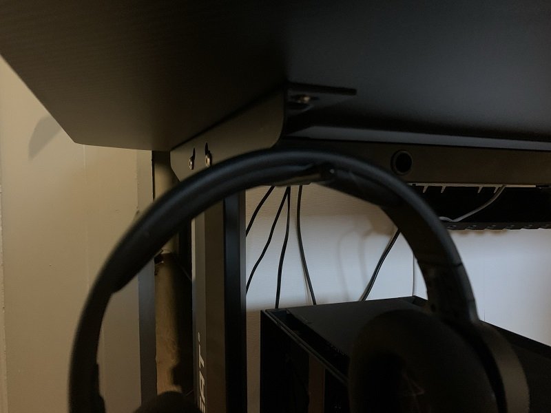 Enfin du côté pratique, le repose casque situé sous le bureau permet d’éviter de le laisser trainer un peu partout et offre un rangement non négligeable. Mon petit point noir viendra du fait que le repose gobelet soit obligatoirement sur le côté droit du bureau. Ayant vécu de mauvaise expérience de rencontre entre une souris et un soda. J’ai personnellement tendance à laisser une boisson à ma gauche. Ne pas pouvoir choisir le côté de ce porte gobelet me frustre un peu et j’aurais aimé qu’il puisse être prévu pour être fixable d’un côté comme de l’autre.