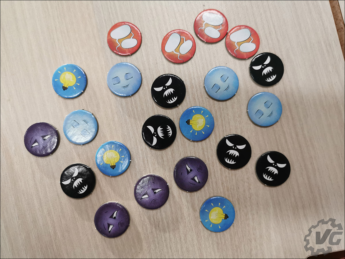 Nous tombons ensuite sur une série de cartes et de jetons ainsi que les six personnages et le Spleen. Le Spleen étant l’incarnation des idées noires, un gros méchant, qui rôde autour de la maison. Les six autres personnages sont Linotte, Tracasse, Gaffe, Courroux, Pagaille et Timoré. Les neuf autres cartes reprennent les quatre émotions (tristesse, peur, colère et honte), les quatre besoins (sécurité, écoute, justice et respect) et enfin le bâton de la parole sur lequel nous reviendrons par la suite.
