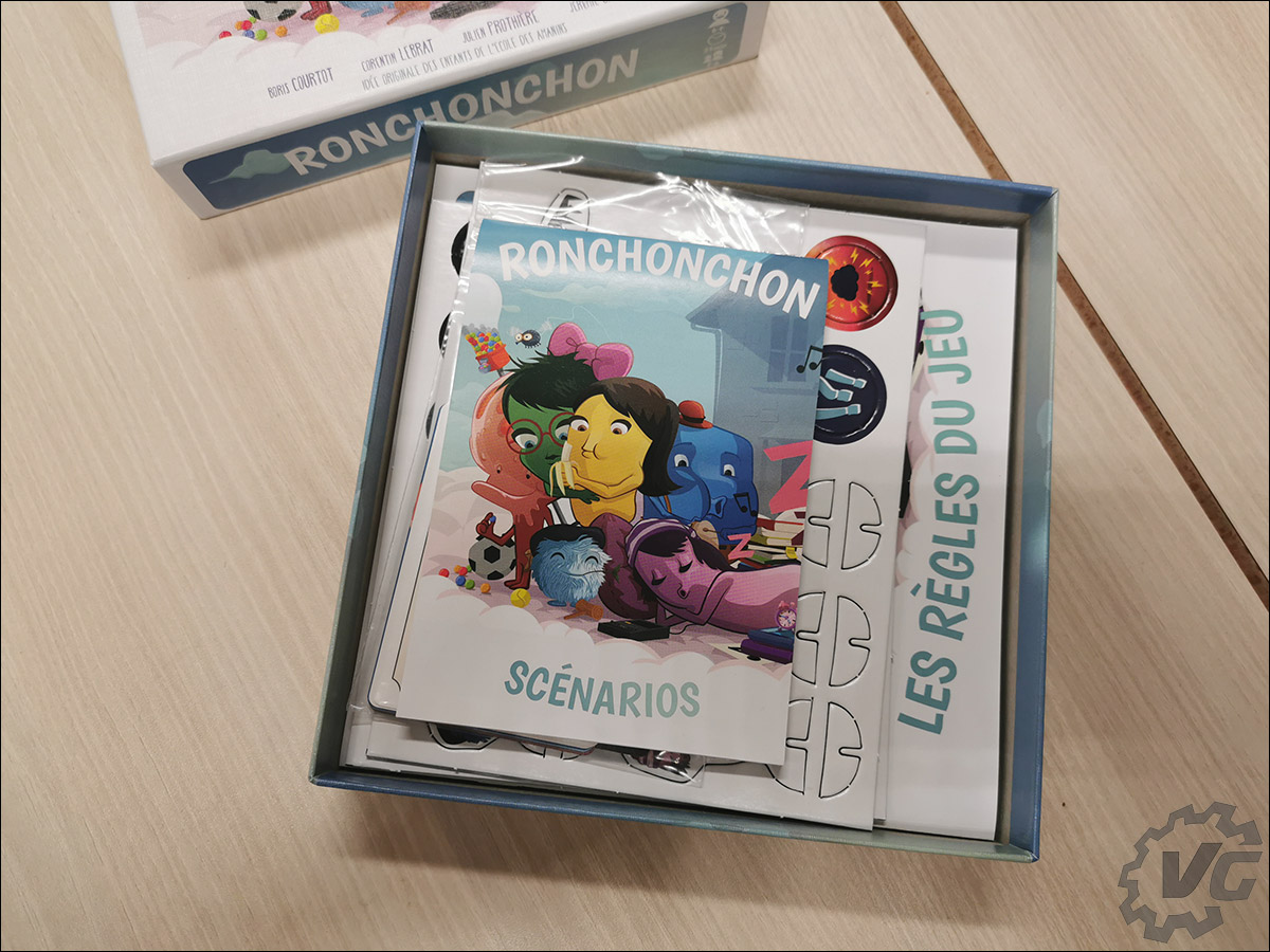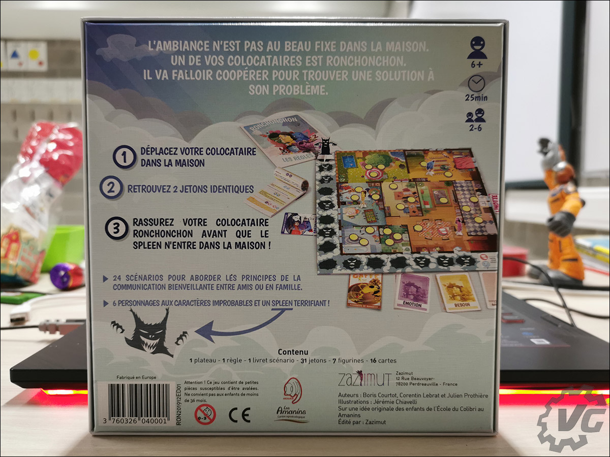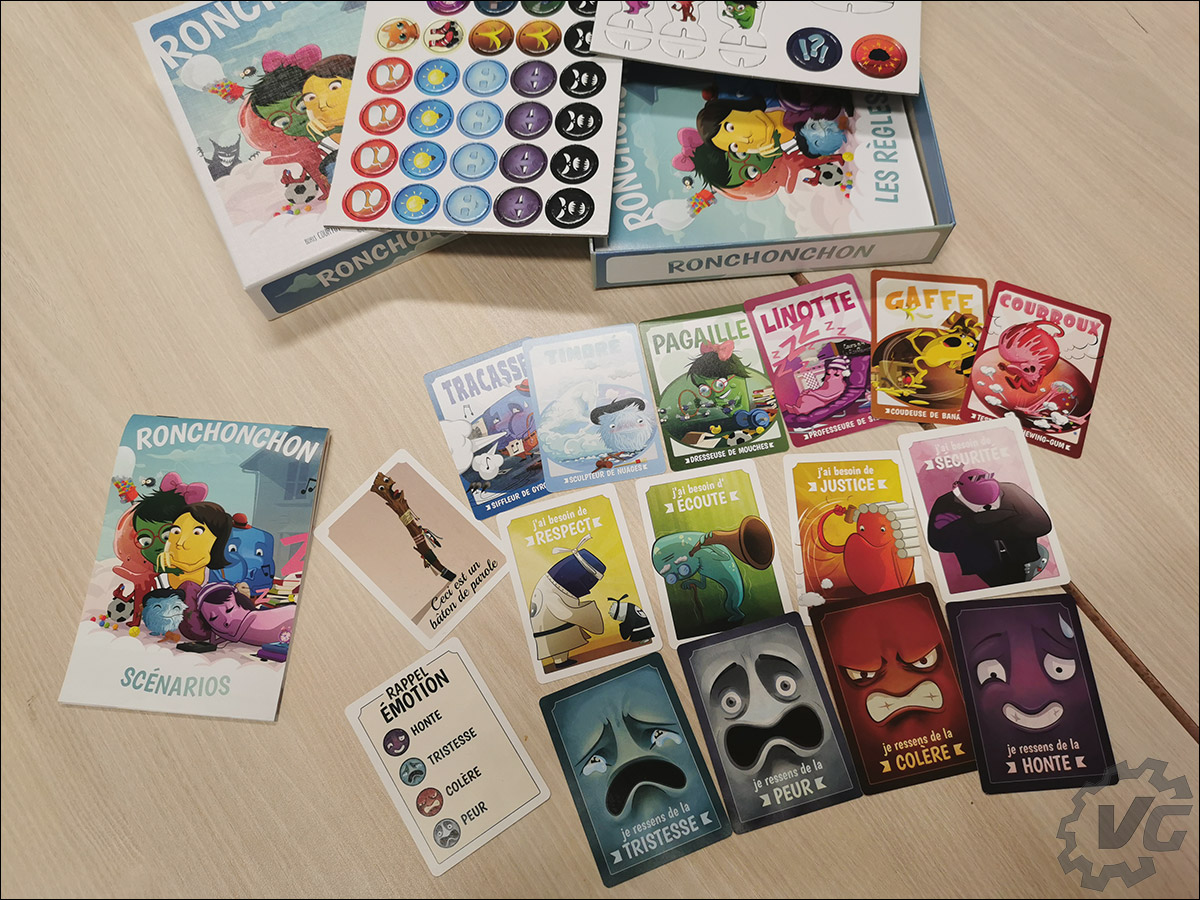 Dans le cadre de ma seconde vie, et oui, je ne me contente pas de faire des articles pour Vonguru ou Overclocking.com, je suis enseignant dans l’enseignement spécialisé en Belgique. Je travaille, cette année, principalement avec des enfants âgés entre 8 et 10 ans et ayant quelques troubles du comportement. Cela peut notamment se manifester par la difficulté de jouer en groupe, de perdre, de se mettre en colère et donc de devoir exprimer, poser une émotion sur son ressenti. La proposition de tester le jeu de société Ronchonchon était donc une excellente idée puisque le principe mis en avant par l’éditeur Zazimut est justement : « Un jeu de plateau pour sensibiliser à la communication bienveillante ».