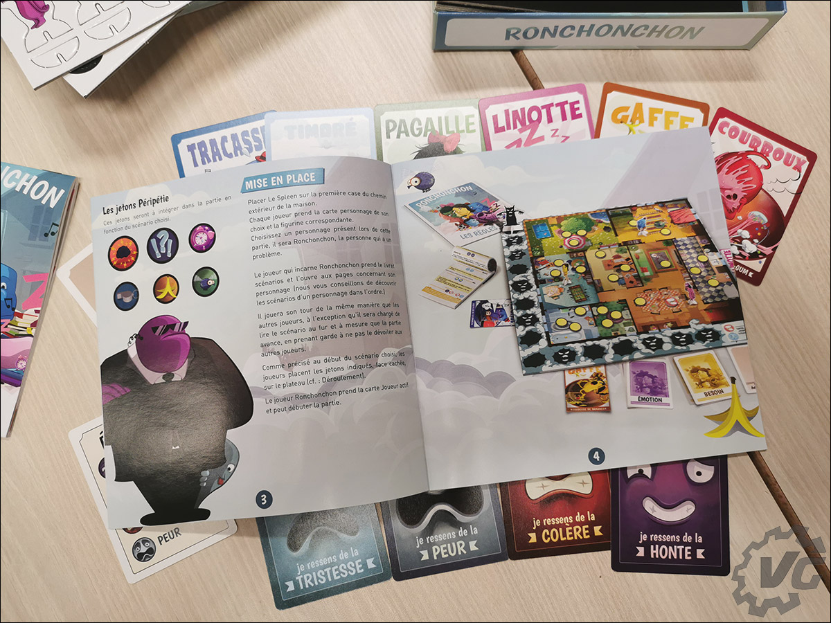 On découvre ensuite le livret scénarios qui contient 4 scénarios par personnage, pour un total de 24. L’idée étant de les faire dans l’ordre selon le personnage qui sera Ronchonchon.