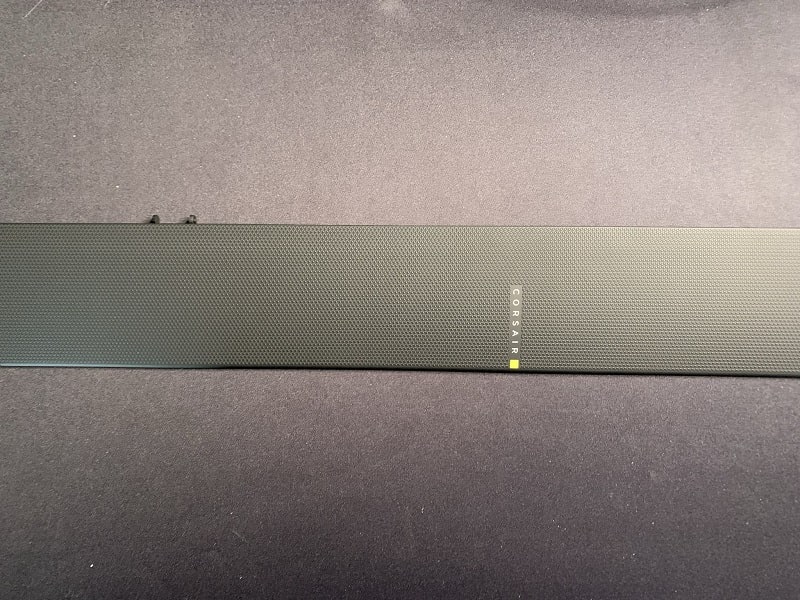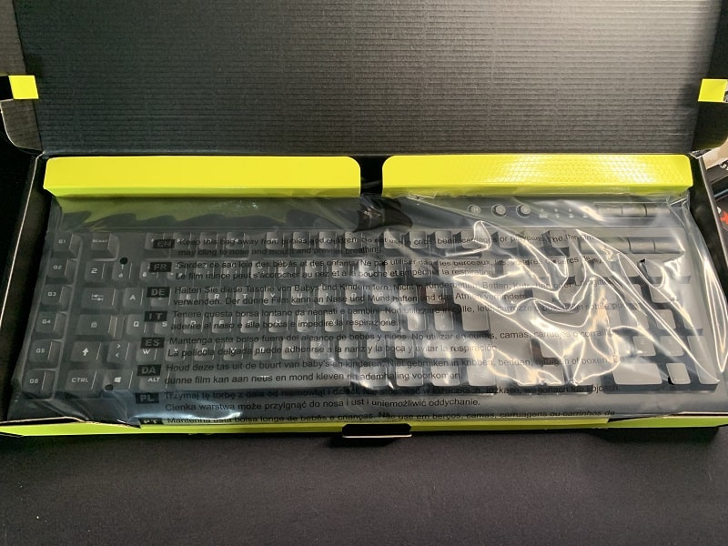 À l’intérieur de la boîte va se trouver naturellement le K55 RGB Pro XT, emballée dans un sac plastique avec ensuite le câble (non tressé) imbriqué à l’arrière de ce dernier. On retrouve également à part un repose-poignet en caoutchouc détachable. Ce dernier viendra s’imbriquer sous le clavier grâce à deux petites attaches souples. Une notice est également prévue en version papier et numérique sur le site de Corsair.