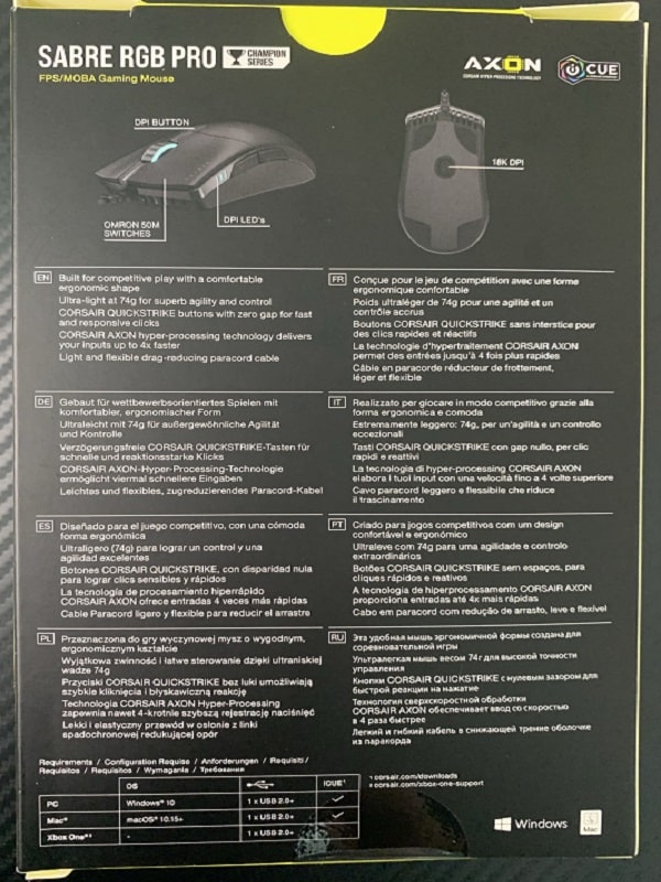 À l’arrière de la boite, on va retrouver quelques informations. Notamment l’usage de la technologie Axon, permettant d’augmenter la vitesse de réponse du périphérique. Ainsi, on peut facilement imaginer une fluidité accrue lors des mouvements de visée. Pour la suite, on peut voir des points relativement standards avec les touches latérales sur le côté gauche et le réglage des DPI sous la molette.