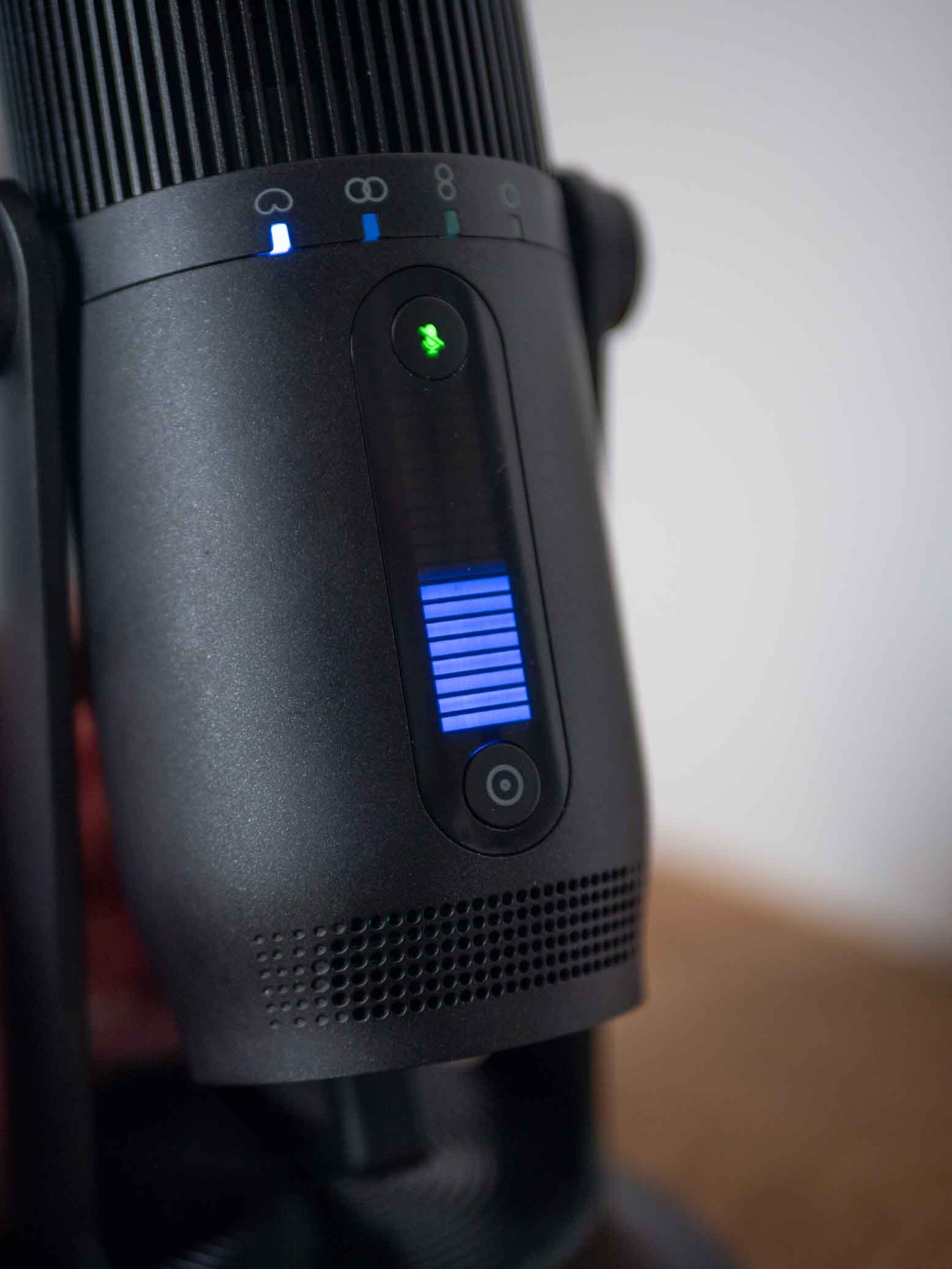 Deux boutons à l’avant permettent pour l’un de mute-démute directement depuis le micro et pour l’autre de changer le mode d’utilisation. Le bouton micro passera au rouge (initialement en vert) si vous êtes muet. Au dessus, les quatre icones correspondant à chaque mode seront allumés en bleu s’ils sont sélectionnés.