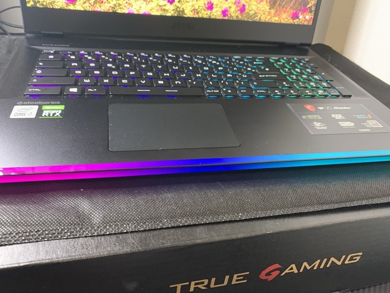 Sur ce point, MSI a fait le choix de la sûreté. Le design général se veut assez sobre avec très peu d’aspect futuriste comme nous avons pu le voir sur d’autres modèles. Le GE76 dans sa globalité ne va prendre, comme réelle appui esthétique qu’une simple barre RGB située sous le clavier. Et naturellement l’éclairage de ce dernier. En dehors de cela, il se veut assez fin notamment au niveau de l’écran, mais moins sur la partie inférieure. De plus, nous avons à l’arrière de celui-ci un rajout de plusieurs centimètres, pour les connectiques et pour l’ajout de deux ventilateurs latéraux. Si le choix se veut louable pour la durabilité du produit, en terme de confort et d’équilibre des poids, c’est autre chose.