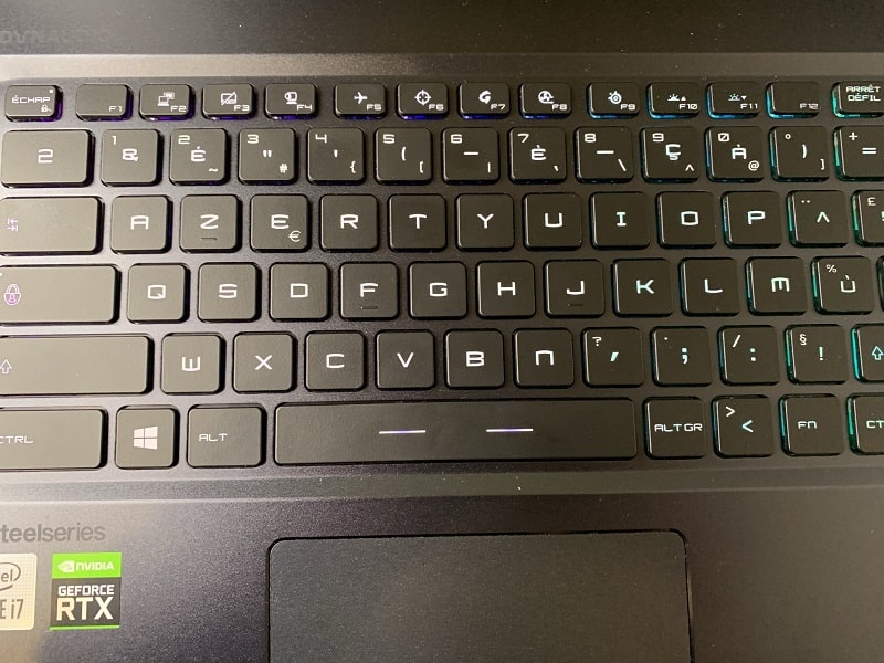 Pour le clavier, MSI se penche d’adopter un style très sobre avec seulement une pointe de RGB. Par ailleurs, on notera que ce dernier est développé par SteelSeries et non par le fabricant.