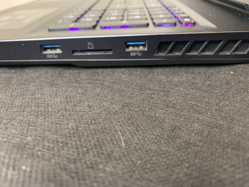 Là où me GE76 devient très intéressant, c’est au niveau de sa connectique. Pour vous détailler rapidement, on dispose ici de trois ports USB 3.2, d’une prise Jack et d’un lecteur de carte. Pour les connectiques vidéos, on retrouvera également un port HDMI et un mini display 1.4. Enfin, on a bien évidemment un port Ethernet RJ45 mais si vous vous sentez plutôt mobile, l’ordinateur embarque également une carte Wi-Fi à la norme 6E pour un maximum de débit à courte portée.