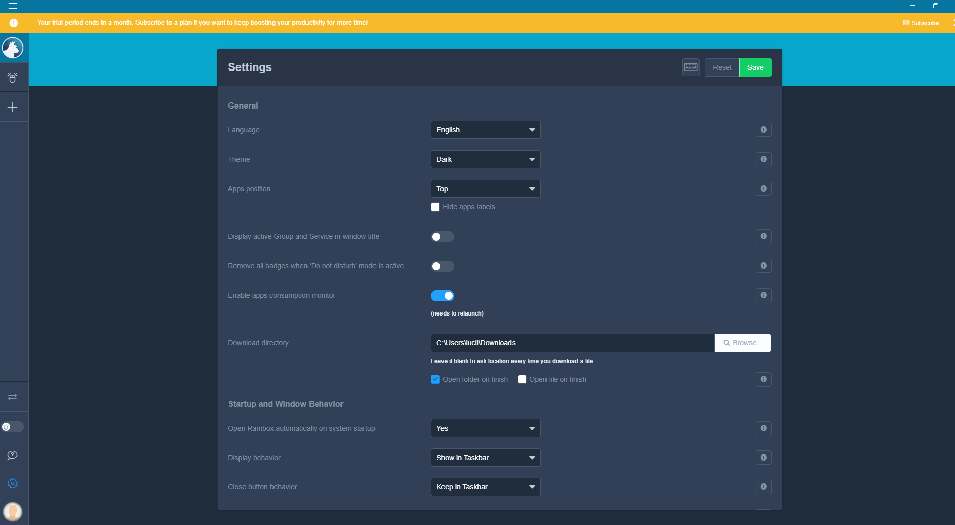 Sachez également que vous pouvez découvrir tout à fait gratuitement et ce pendant 30 jours la version PRO, sans avoir à rentrer vos coordonnées bancaires ou quoi que ce soit d’autres. Ainsi, vous pourrez vous décider quant à savoir si la version PRO est plus adaptée à vos besoins ou si la version gratuite vous convient déjà totalement. Contrairement à la version gratuite, Rambox PRO est uniquement en anglais.