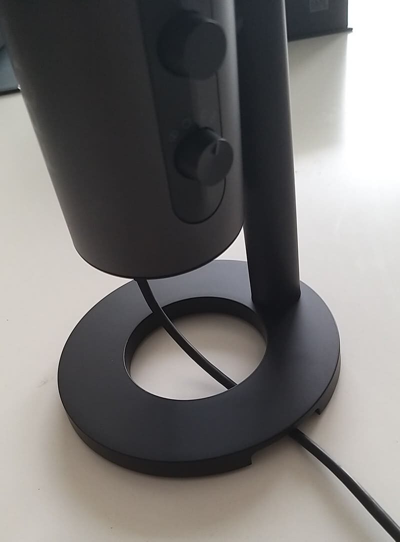 Pour le test, peu de manipulations sont nécessaires avant de pouvoir utiliser le produit. Puisqu’il s’agit d’un système de Plug-and-play il faut brancher le micro grâce au câble UBS à son ordinateur, et le microphone fonctionne directement. Vous pouvez de plus brancher un casque grâce à la prise jack si vous le souhaitez. Vous pouvez ensuite le placer sur votre bureau grâce au support. Ce dernier s’installe et se visse très facilement, et il y a un petit espace pour faire passer le fil sous le support. C’est là encore que j’ai regretté l’absence d’un câble tressé, car chaque déplacement du microphone pourra mettre à mal le fil et l’abimer quelque peu.
