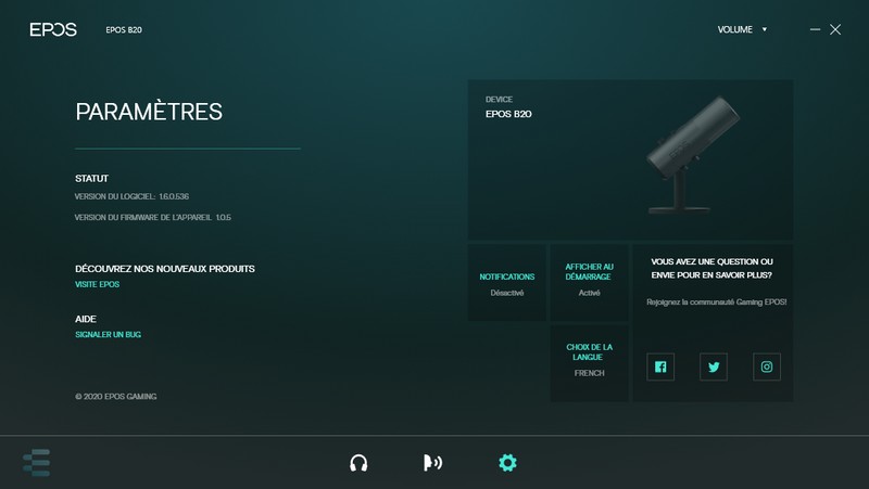 Il existe un logiciel qui permet d’optimiser son expérience utilisateur sur le microphone B20. Il s’agit de la Gaming Suite EPOS. Sur ce logiciel, on accède à de nouveaux paramètres de personnalisation.