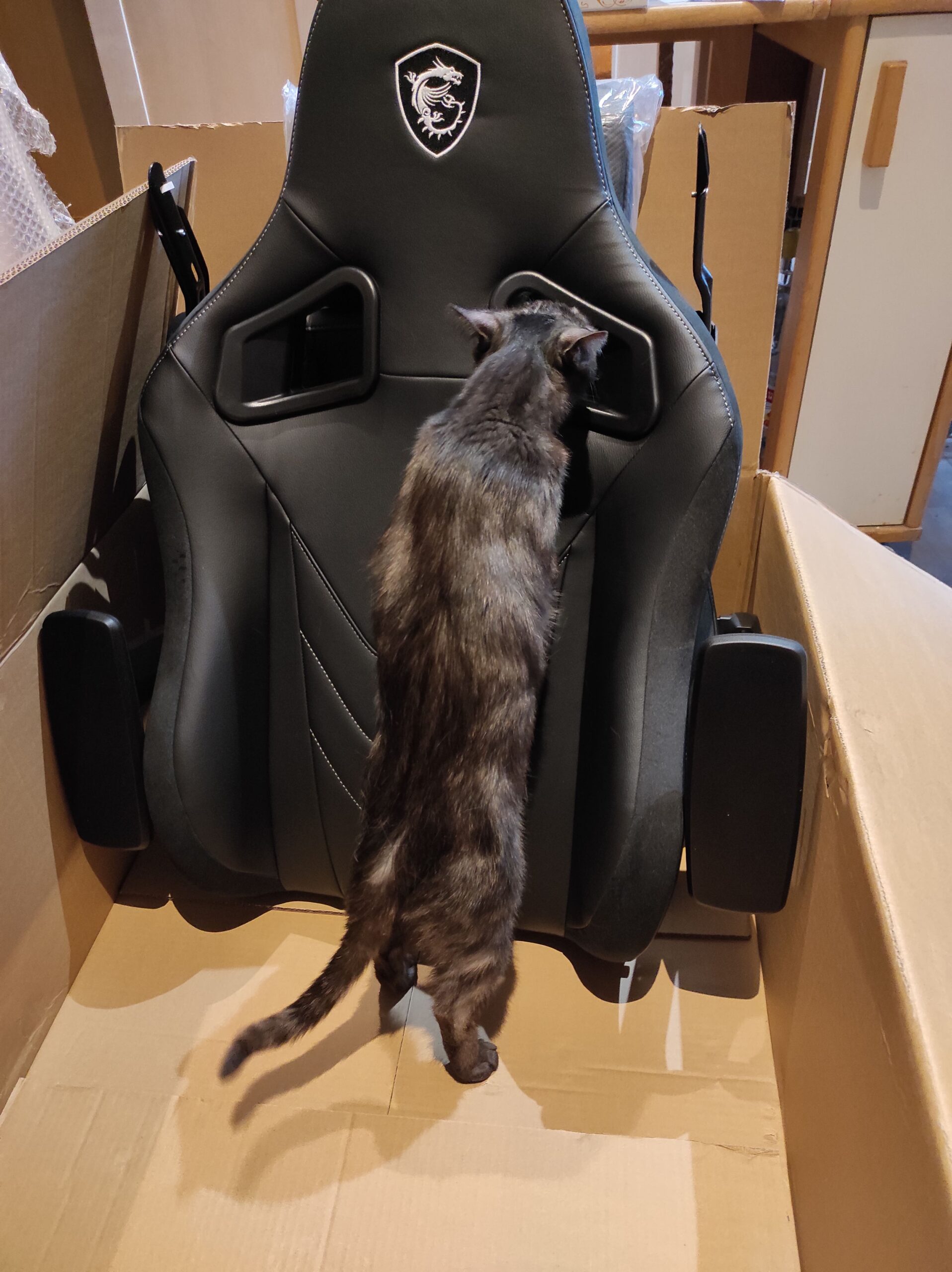 Effectivement, je vis toujours sur ce même siège et en suis toujours très content. Quant au chat… franchement, chaque fois que je quitte le fauteuil, et particulièrement la nuit, je pose un coussin dessus, après avoir fait l’erreur d’avoir laissé le petit monstre s’y installer et y planter ses griffes une fois. De même, quand le siège est trop près de l’arbre à chats, il arrive audit monstre de tendre les pattes pour donner de petits coups de griffe sur les côtés. Bon, le siège étant quand même de très bonne qualité, cela fait des traces presque invisibles, qu’il faut chercher pour les voir, mais il faut accepter l’idée qu’il sera forcément un peu marqué à terme et faire un minimum attention. J’espère avoir pu répondre convenablement, et n’hésite pas si tu as d’autres questions !