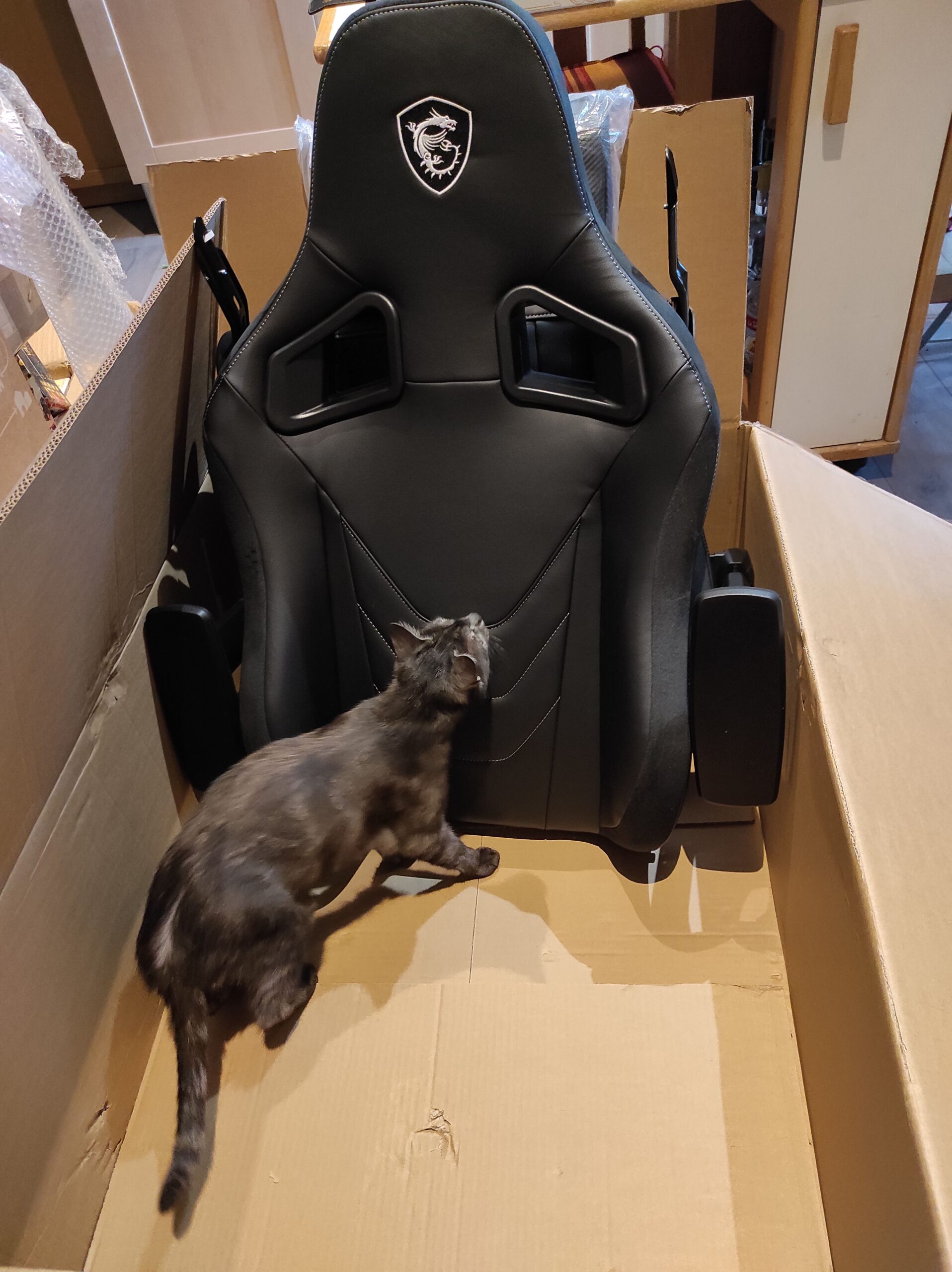 Pour cela, j’ai dû « tricher » sur le seul élément qui ne me satisfaisait pas, le coussin des cervicales que je trouvais décidément trop bas, étant donné qu’il m’arrivait plutôt dans le dos. Pas nécessairement inconfortable à petites doses, mais empêchant mon dos de profiter de tout le dossier, et certainement pas très bon sur le long terme. Ai-je mal fait quelque chose ? Est-ce prévu pour de plus petits dos ? Au moins ai-je trouvé rapidement une vraie solution plus satisfaisante que son regrettable évincement, en l’accrochant derrière la partie supérieure du dossier, recouvrant le dragon MSI. J’ai d’ailleurs découvert avec amusement une vidéo de présentation du siège faisant de même.