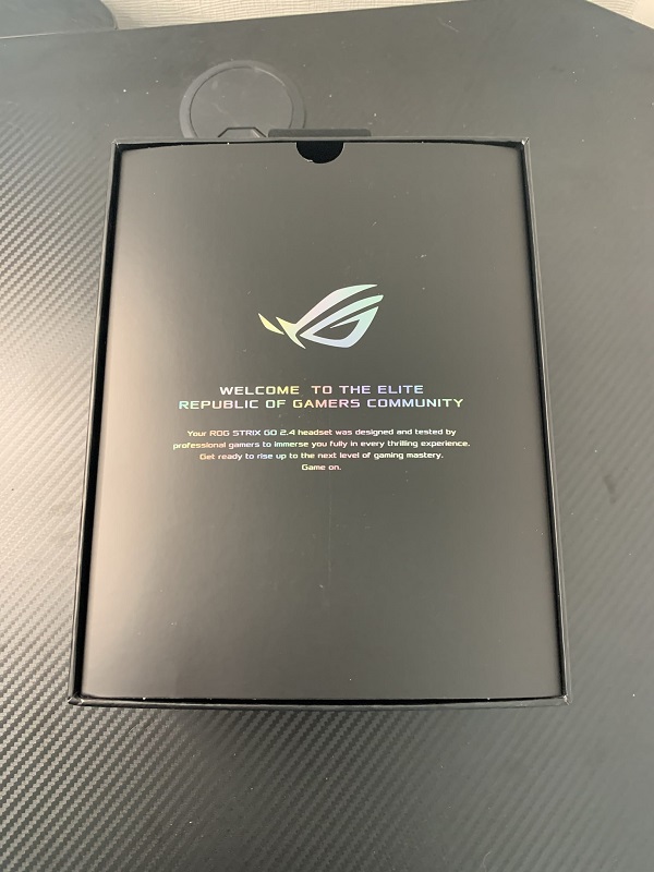 Tout comme pour la version 2.4, on retrouve une boîte au packaging similaire. Une mise en avant dudit casque avec pour fond quelques effets visuels très graphiques. Le produit reste cependant bien en valeur et les fioritures donnent dans la sobriété. On va cependant noter que le ROG Strix dispose de la certification Teamspeak et Discord. Un axe donc pris sur la qualité vocale.