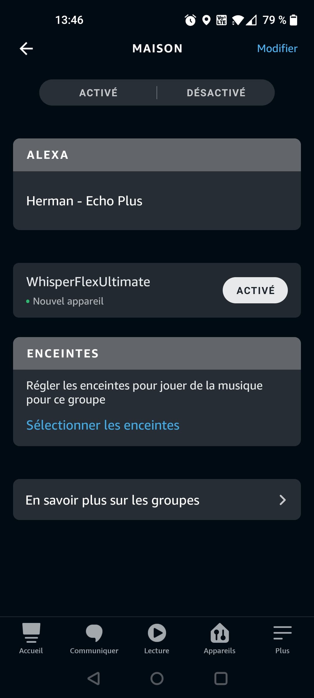 Après avoir recherché la Skill Duux sur l’application Alexa, on vous demandera d’autoriser et d’associer les deux ensemble. Une fois fait, vous pourrez, si vous avez déjà des groupes et des pièces comme ici, ajouter le ventilateur à celui qui vous conviendra le plus. Ici, c’est maison, qui comprend mon Echo Plus principal, puisqu’il embarque un pont ZigBee et que pour la durée du test, le Whisper Flex est resté dans la pièce principale.