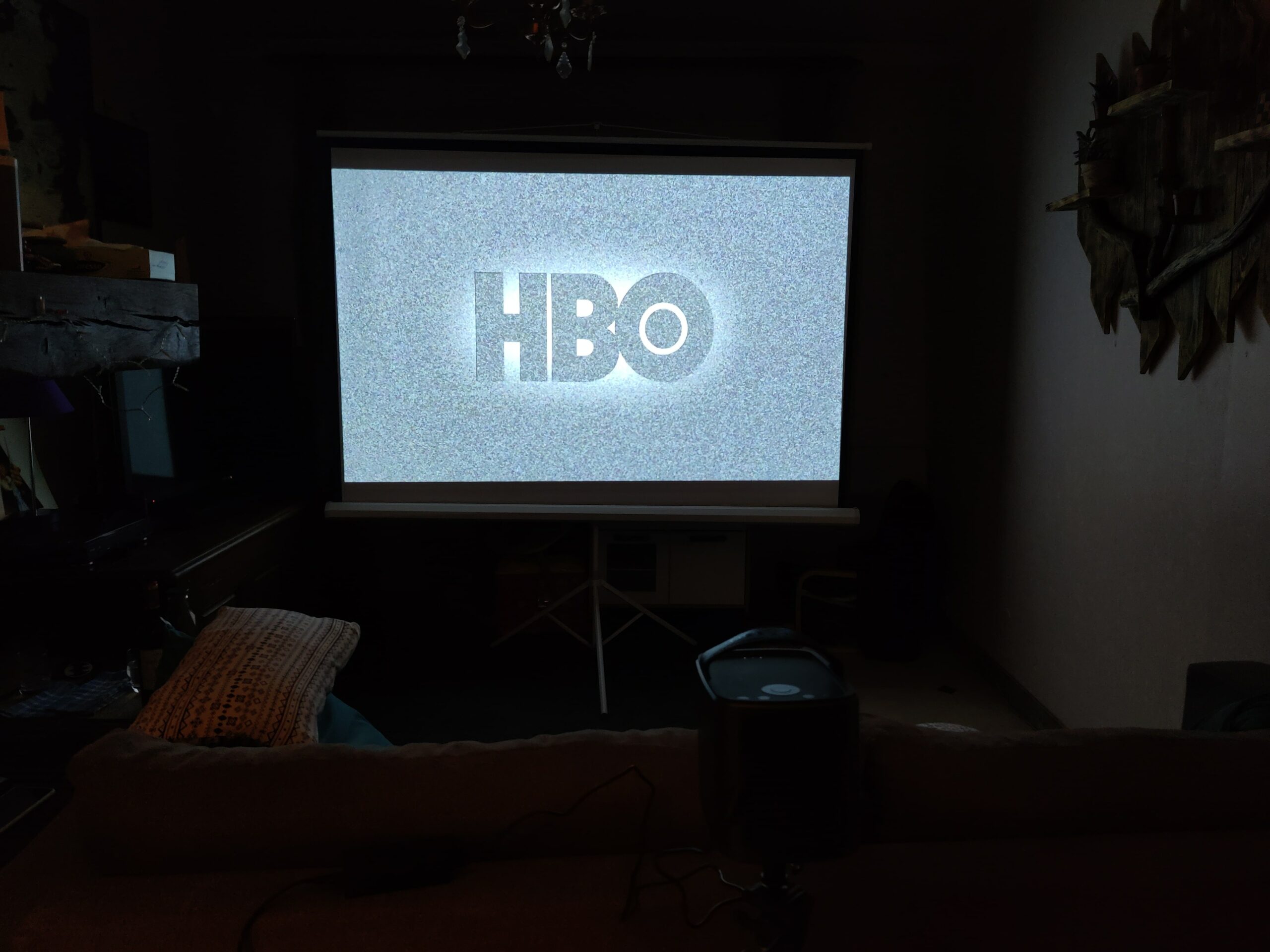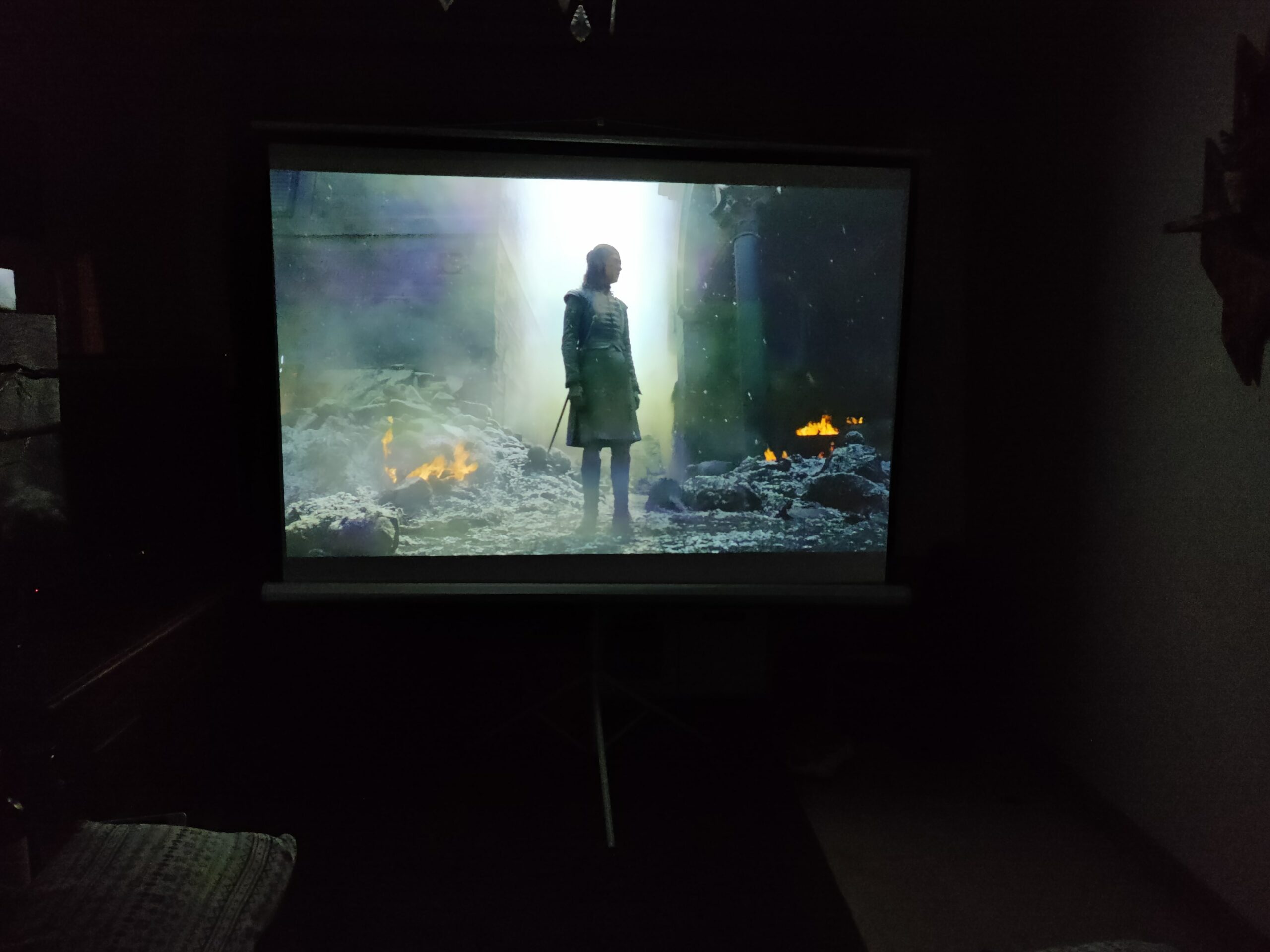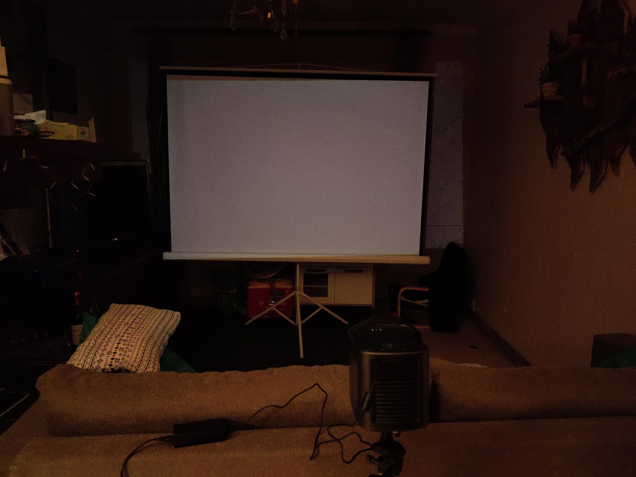 Il s’agit ici de mon tout premier projecteur, et je dois dire que j’ai effectué quelques recherches dessus afin de pouvoir le tester au mieux. Déjà, si effectivement un mur blanc suffit, en théorie, vous verrez que déménager tout un salon par exemple est assez compliqué selon la disposition de votre maison… Ainsi, j’ai donc investi dans une toile de projection que j’ai trouvé sur le bon coin moyennant 35 €. Voici donc le premier rendu.