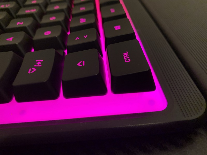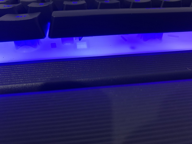 Si ce soucis peut être réglé par le retrait simple de cette barre, le second soucis est d’un autre acabit. Les touches sont, à mon sens, beaucoup trop hautes. Si dans un premier temps on trouve le frameless comme une bonne idée, on ressent très vite ce gain de hauteur. Votre main s’incline inexorablement encore plus vers le haut et ce même quand le clavier est posé à plat. Toute une gymnastique des mains vient à se réorganiser pour retrouver votre efficacité d’antan sur votre jeu préféré.