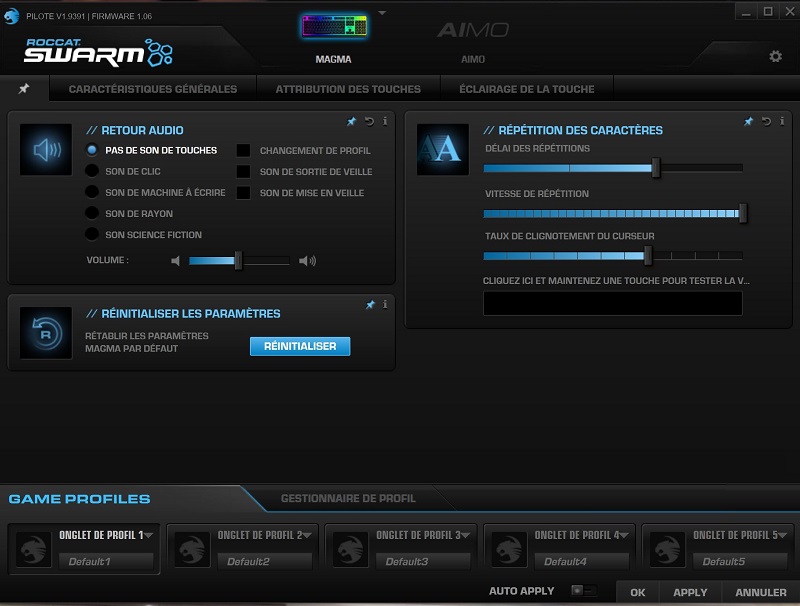 Si on s’attarde dans un premier temps sur la luminosité, on dispose des traditionnelles possibilités. Que ce soit au niveau des effets lumineux ou le réglage par zone, on retrouve des acquis de longue date qui nous permettent une customisation complète. Roccat se permet par ailleurs quelques petites fantaisies. En effet, puisque les touches sont réputées silencieuses, pourquoi ne pas ajouter quelques petits sons ici et là ? Notre préféré se reposera sur la machine à écrire qui donne un effet d’antan avec un look futuriste. On rêve tous d’une machine à écrire RGB n’est ce pas ?