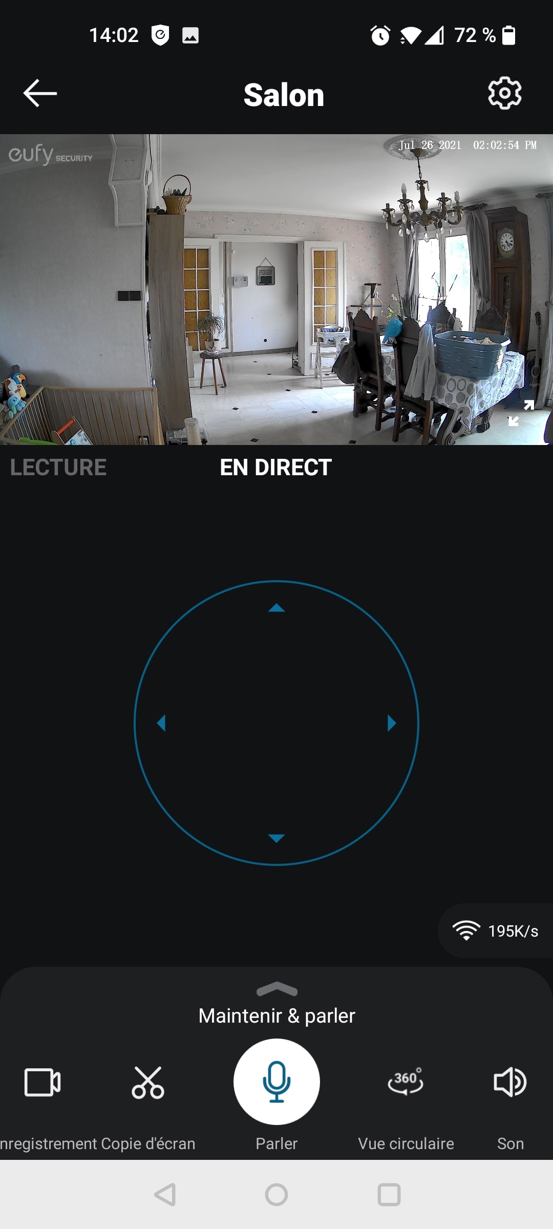 De mon côté, j’ai opté pour la microSD, non fournie ici. Je trouve cela assez dommage de ne pas pouvoir stocker sur la HomeBase, tout simplement car cette dernière et la caméra ne communiquent pas entre elles. Aussi, la SD se remplit très vite, et il sera difficile de pouvoir enregistrer, par exemple, tout le week-end. Je précise que j’ai installé une microSD de 32 Go et que l’application nous permet de choisir si on souhaite enregistrer en 2K ou bien baisser la résolution. En revanche, vous pouvez très bien accéder en direct à votre caméra en cliquant sur « direct » afin de vérifier que tout se passe bien chez vous pendant votre absence. Un vrai plus pour surveiller mes minous les rares fois où je m’absente. Bien sûr, même à distance, vous pouvez orienter la caméra comme bon vous semble grâce à l’application.