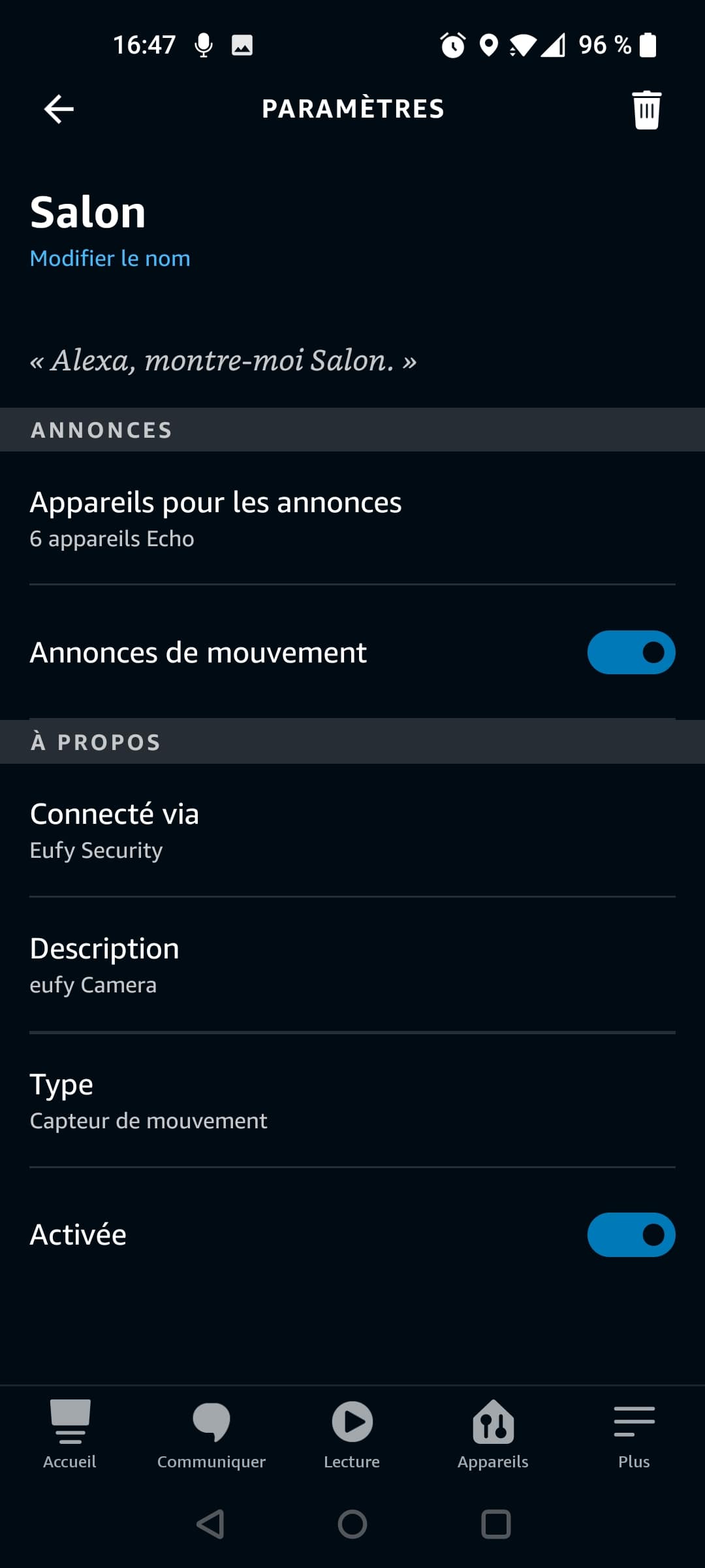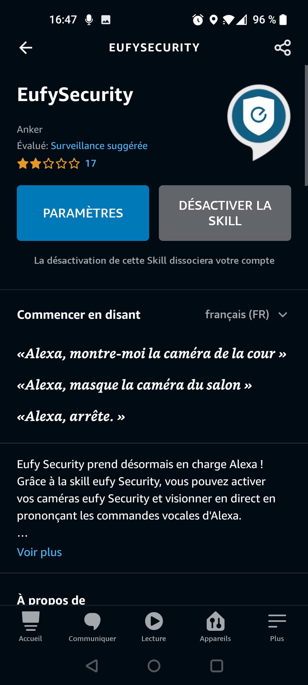 Bien sûr, notre caméra papote avec Alexa. Une fois que la skill EufySecurity sera installée, vous pourrez interagir avec votre équipement, l’ajouter à un groupe et/ou à une pièce, le renommer. Comme toujours, même s’il s’agit d’un gadget, c’est très pratique si nous n’avons pas l’application à portée de main.