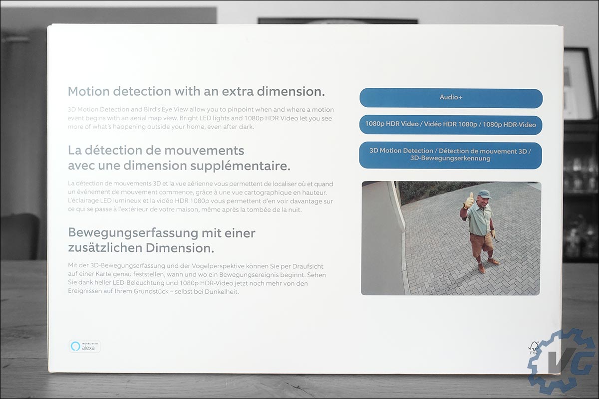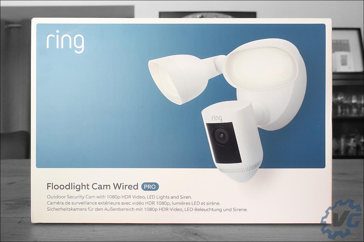 Le Floodlight Cam Wired Pro est livré dans une boite assez imposante dont les dimensions sont de 360 x 170 x 250 mm. Sur la face avant, on retrouve une illustration du Ring Floodlight Cam Wired Pro ainsi qu’une phase qui résume assez bien le produit : « Caméra de surveillance extérieure avec vidéo HDR 1080p, lumière LED et sirène ». À l’arrière, c’est la surveillance 3D qui est mise en avant et dont nous vous parlerons durant le test proprement dit et qui est une nouveauté de cette nouvelle version par rapport à la génération précédente.