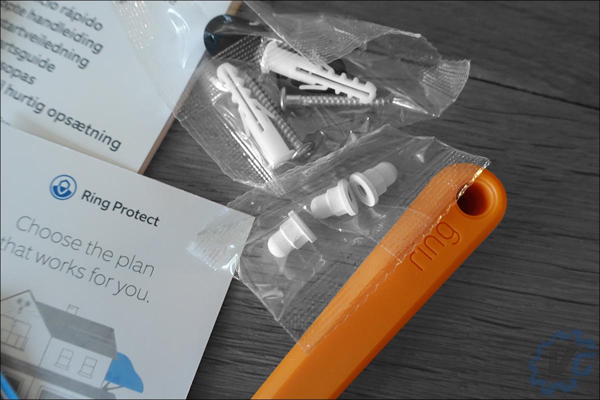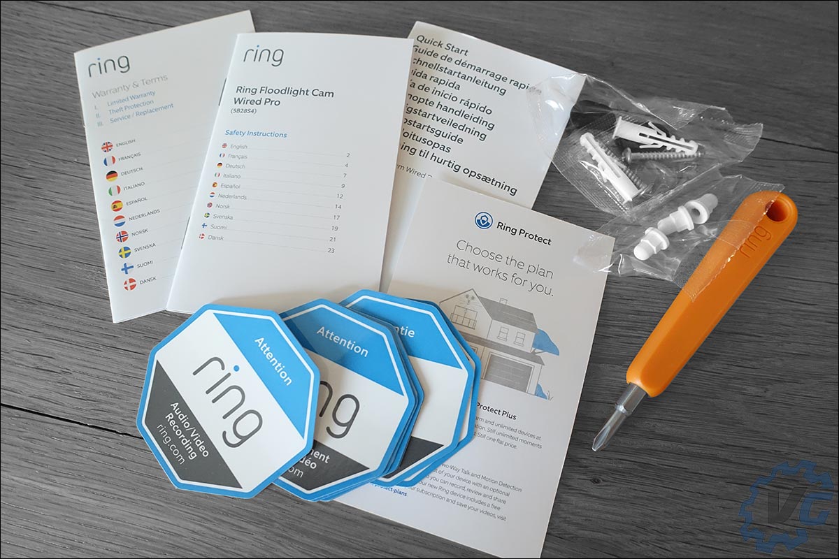 Une pochette cartonnée dans laquelle se trouve un tournevis cruciforme et plat, la tête pouvant être retournée. On retrouve aussi plusieurs notices (garantie, installation rapide, les différents abonnements, les chevilles et vis d’installation) ainsi que des autocollants à apposer sur vos fenêtres pour avertir de l’utilisation d’un système de surveillance.