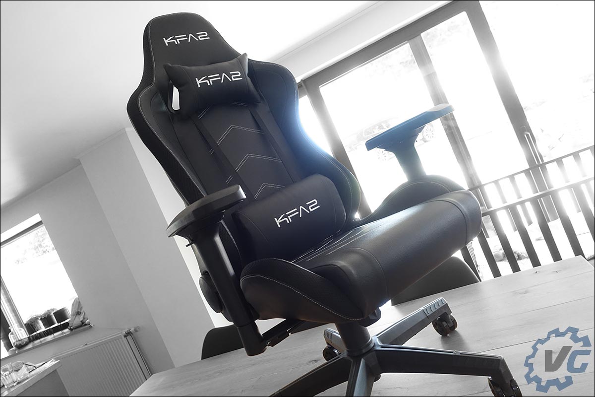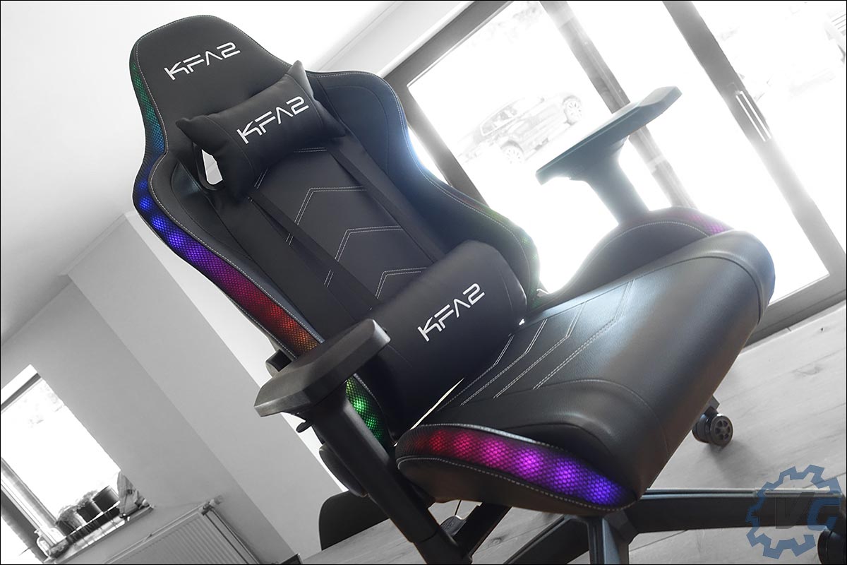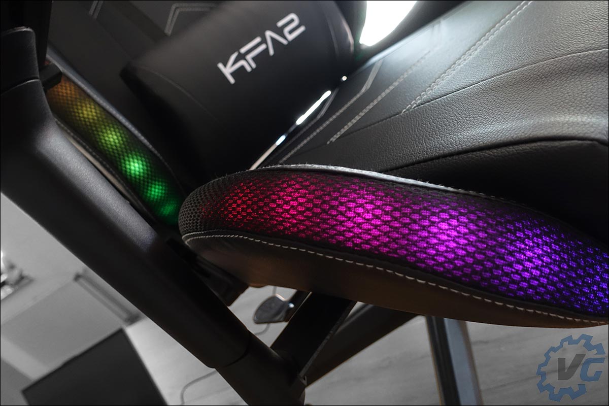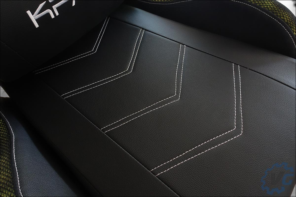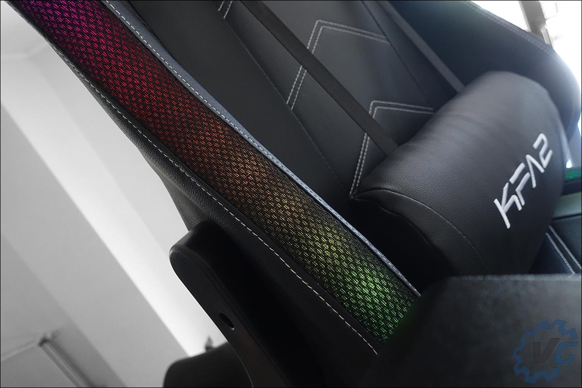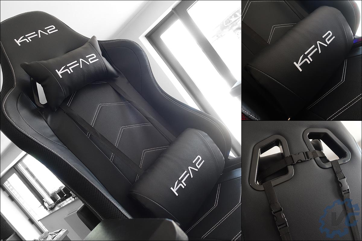 L’assise et le dossier bénéficie à certains endroit d’une surpiqûre blanche. Sur le haut du siège et uniquement sur la face avant, on retrouve le nom KFA2 brodé. Enfin, pour terminer, vous aurez l’occasion d’ajouter un coussin de tête et un coussin lombaire.