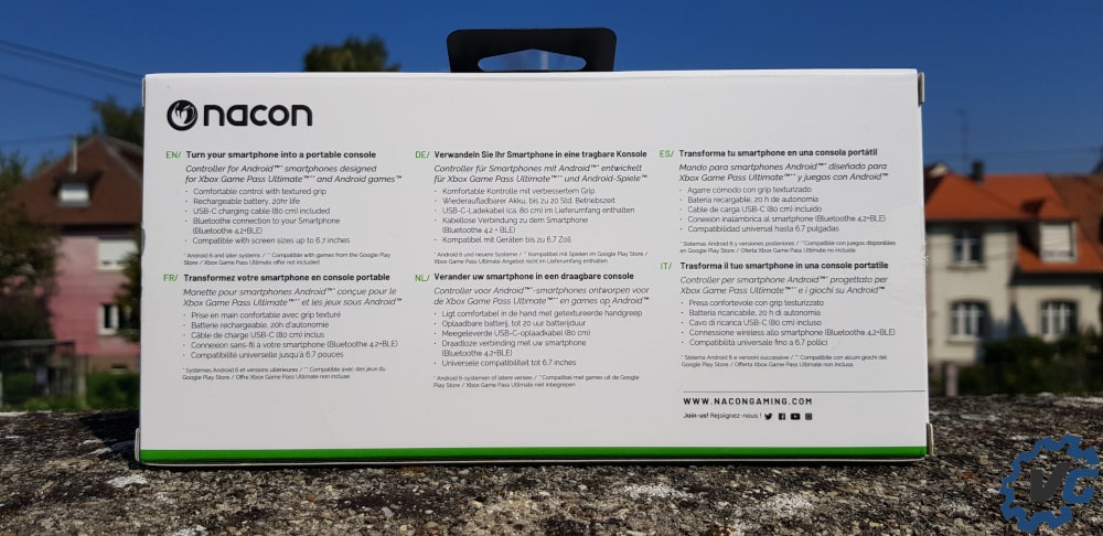 La boîte de la Nacon MG-X est très classique et met bien en avant les caractéristiques principales de la manette. Une connexion Bluetooth, un coulissage rendant la manette adaptable à tout téléphone ou presque (jusqu’à 6,7 pouces de diagonale) ainsi que la compatibilité avec Android. Le terme Xbox est également largement mis en avant et Nacon est fier d’annoncer la compatibilité totale avec le Game Pass.