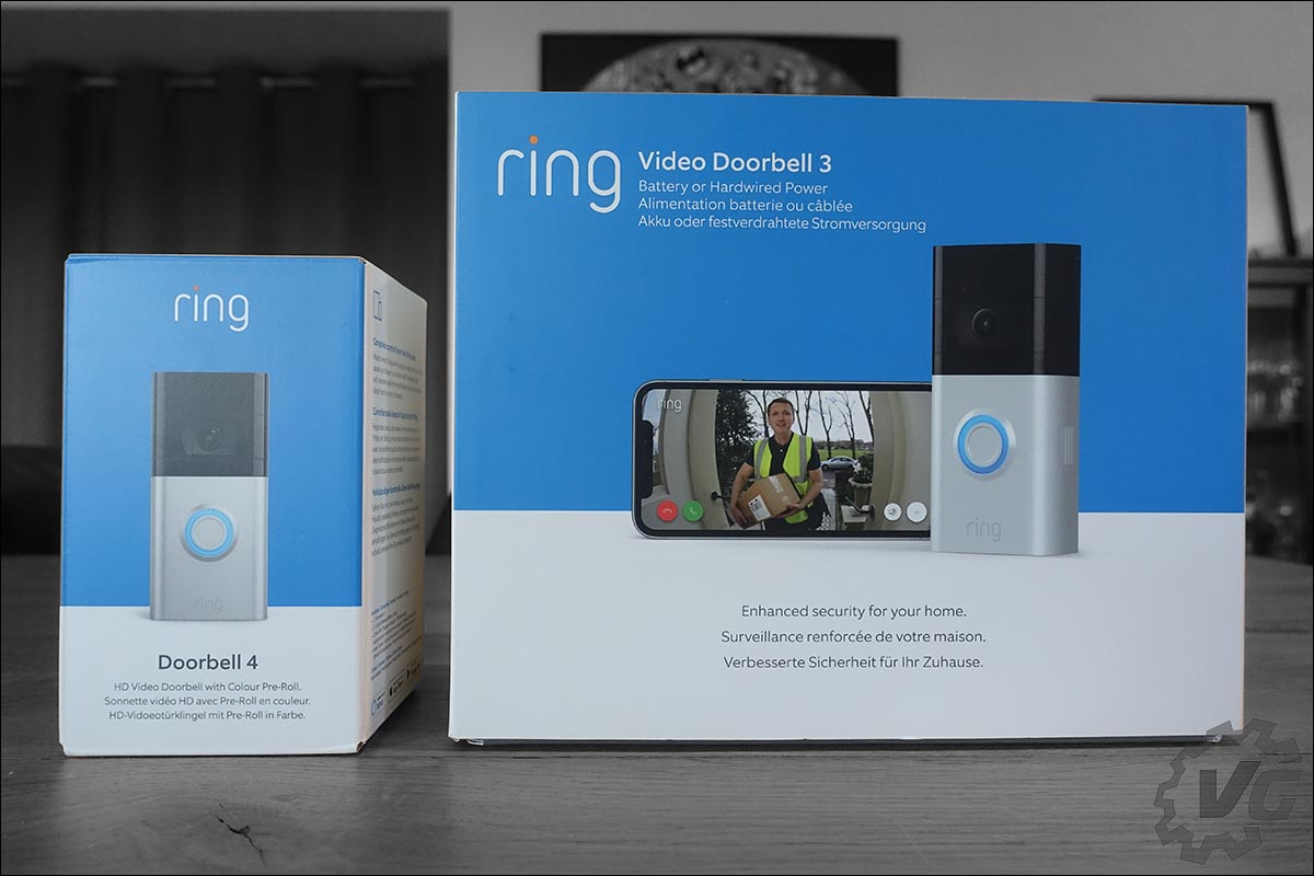 Tout d’abord, ce qui frappe le plus, c’est la différence de taille entre la boite de la version 3 et cette nouvelle version 4. Ring aurait-il optimisé son packaging ou aurons-nous droit à moins d’accessoires ? Lorsque nous faisons une photo des deux boites l’une à côté de l’autre, aucun doute, la boite a subi un sacré lifting ! En réalité, il s’agit d’un choix afin de réduire l’emballage et de ne plus utiliser de coque plastique comme c’était le cas pour la V3.